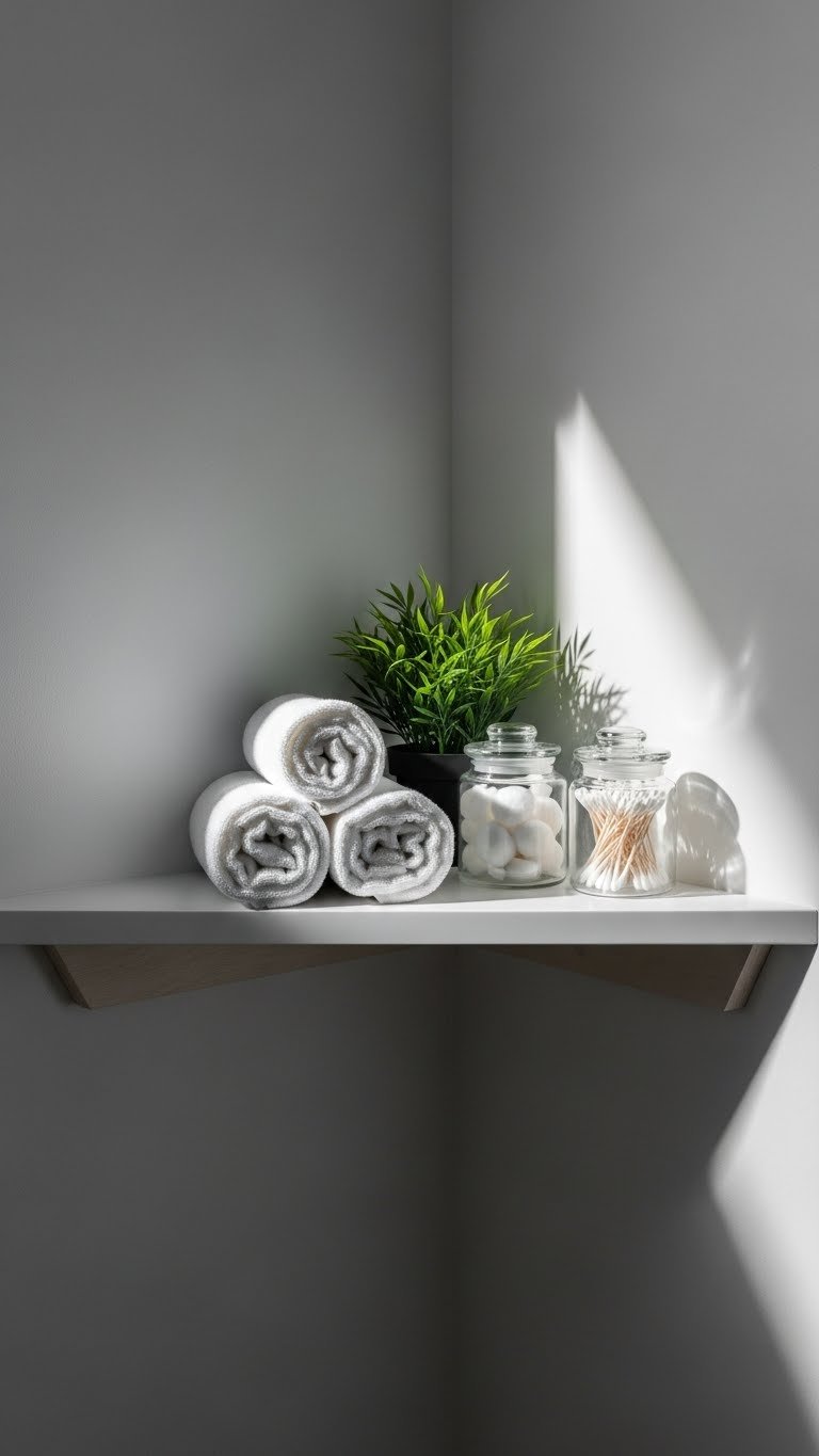 Corner shelves cost $20–$60 depending on material and size. Installation takes 15–30 minutes with a drill and level. Fill with small plants, a pillar candle, rolled washcloths, or a stack of design books. IKEA, Target, Wayfair, and Home Depot have affordable options. Renters: adhesive corner shelves exist but work best on tile.