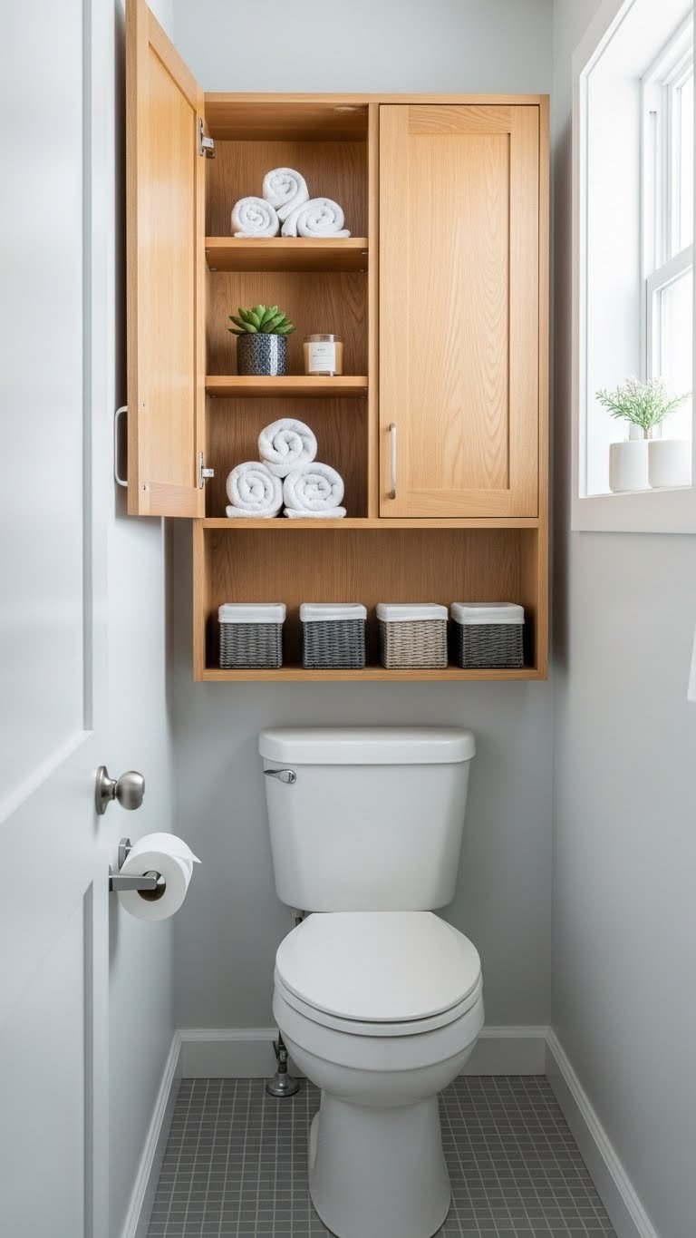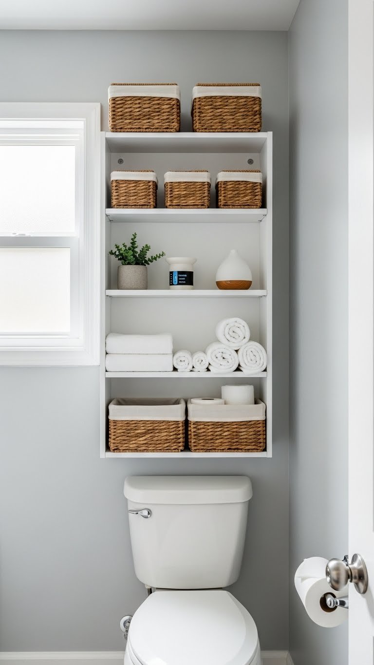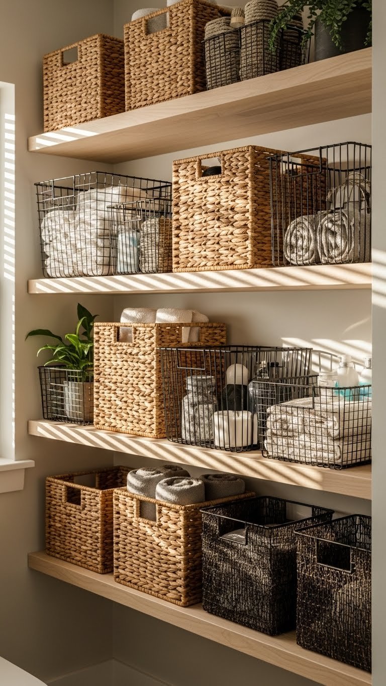Woven baskets add texture and warmth while hiding clutter. They’re perfect for small bathrooms where open shelves need organization without looking chaotic.