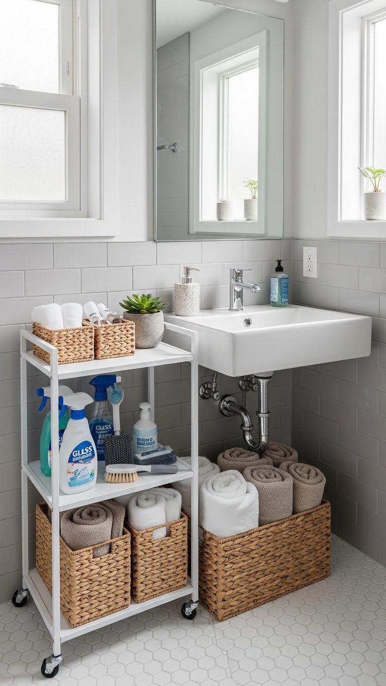 Bathroom-safe woven baskets (sealed or waterproof-lined) cost $15–$50 each depending on size. Fill them with extra towels, cleaning supplies, or bath essentials. Stack or line them on open shelves or the floor. Look for seagrass, water hyacinth, or plastic-lined woven options. Target, West Elm, Wayfair, and Container Store have beautiful choices.