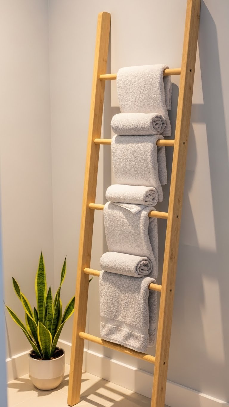 Your towels become part of the décor instead of hidden away, and the ladder adds vertical visual interest without taking up floor space. Your bathroom immediately looks styled and intentional.