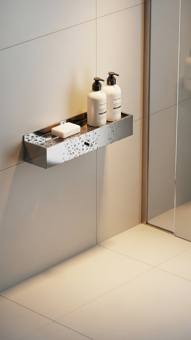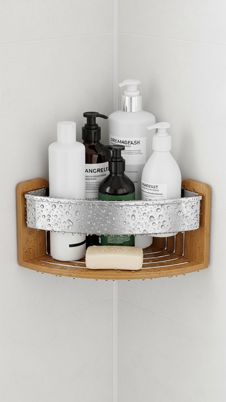 A narrow shelf unit or corner caddy maximizes vertical space in small bathrooms, keeping daily essentials accessible without counter clutter.