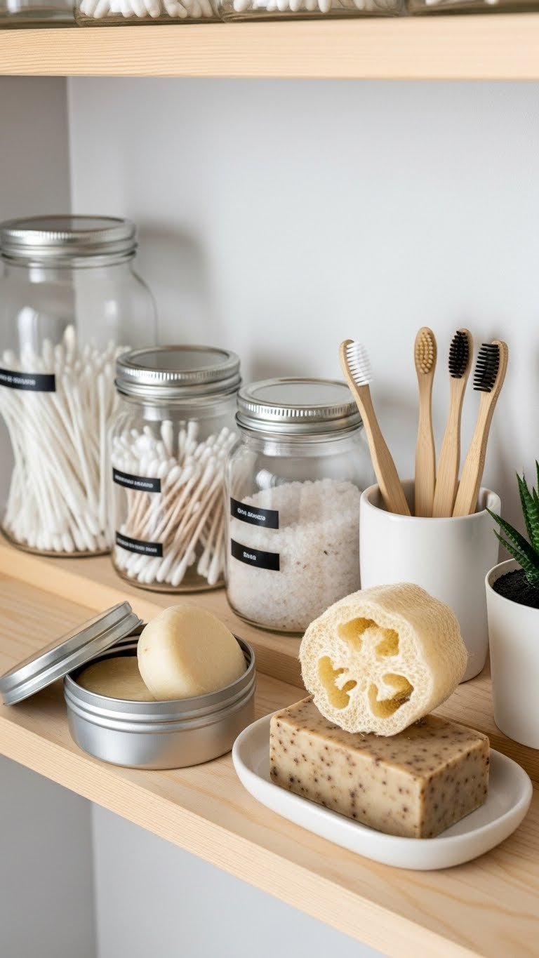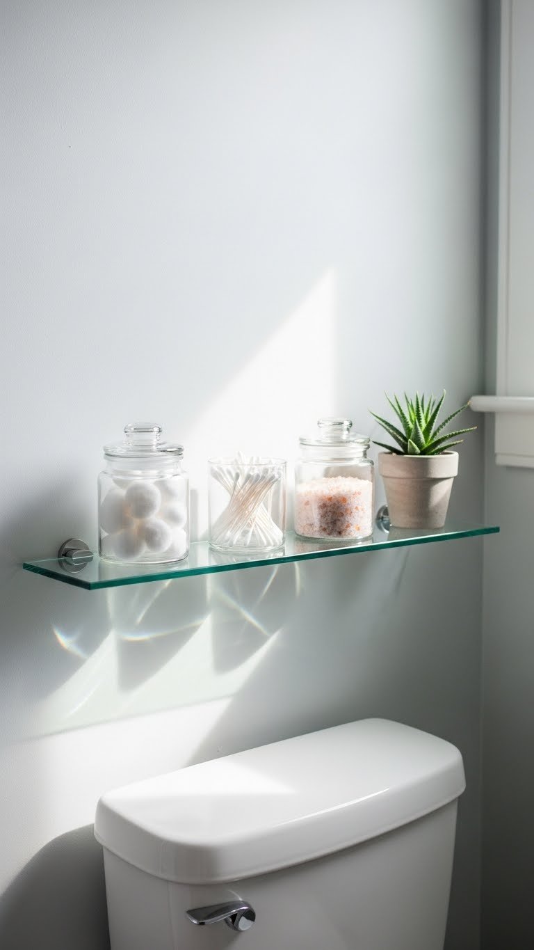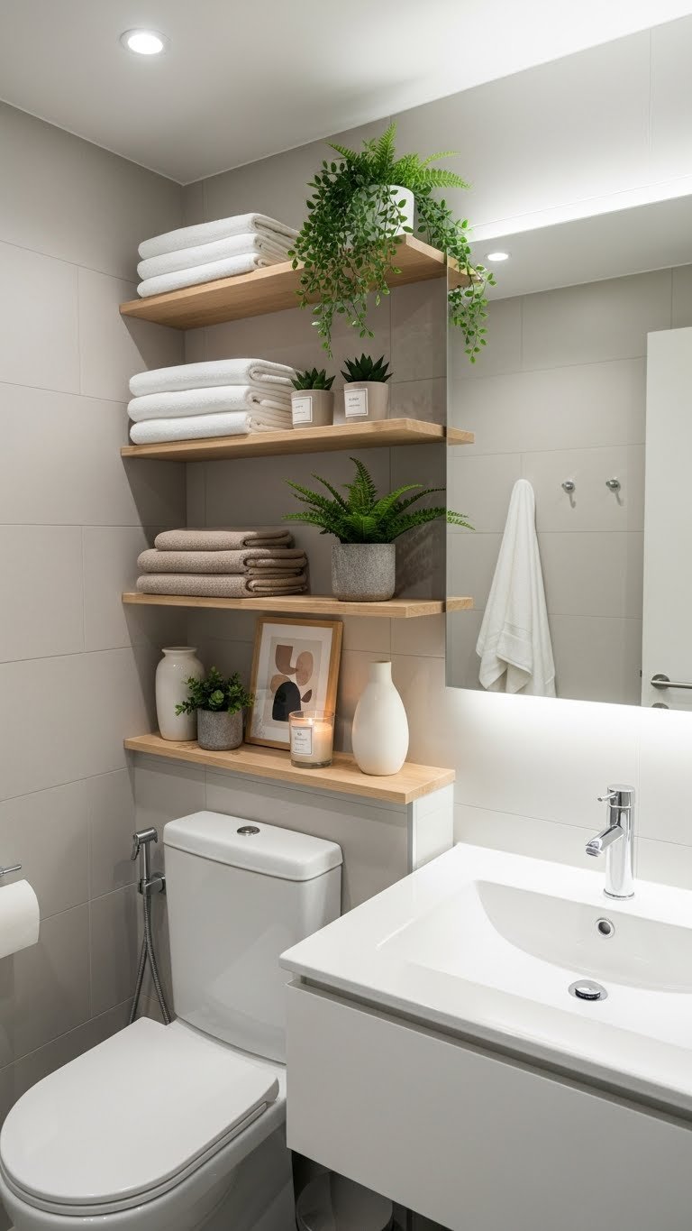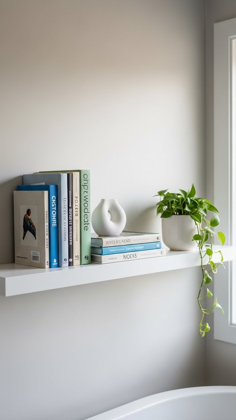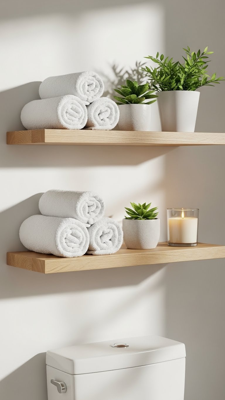 Floating shelves cost $25–$80 per shelf depending on material (wood, metal, or composite). Installation takes 30–45 minutes with basic tools or a drill. Mount them at varying heights—one above the toilet, one above the sink, one near the shower—for visual interest and function. Fill them with rolled towels, glass jars with cotton balls or bath salts, and a few small plants. Target and IKEA have affordable options; Wayfair and Amazon offer higher-end designs.