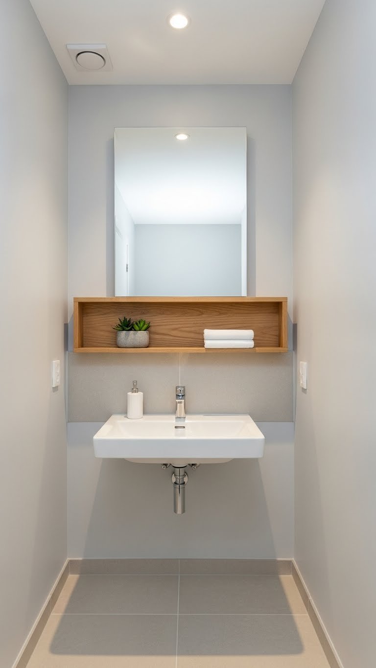 A basic pedestal sink runs $100–$300; a slim wall-mounted vanity (12–18 inches wide) costs $150–$500. Installation typically requires plumbing adjustments ($150–$300 if you hire help). You lose under-sink storage, so pair this idea with #3 (floating shelves) for compensation. Home Depot and Wayfair have good selections. Pedestal sinks work best in rentals since they require fewer modifications than removing cabinetry.