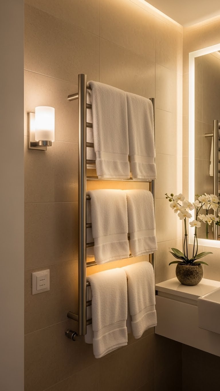 A heated towel rack is the ultimate comfort upgrade—warm towels feel genuinely spa-like, and the rack doubles as a discreet space heater in chilly bathrooms. It’s a “small luxury” that justifies itself fast.