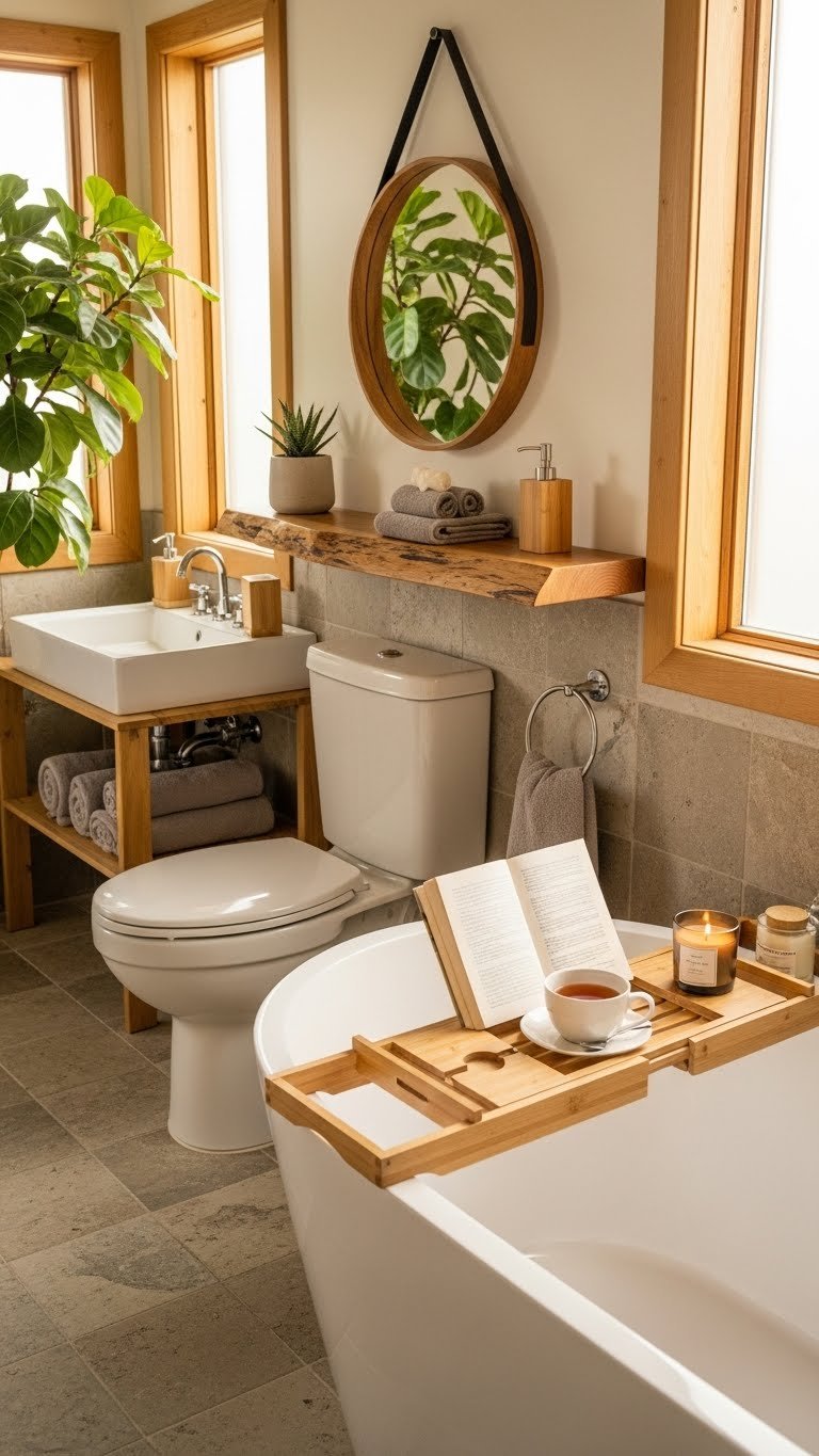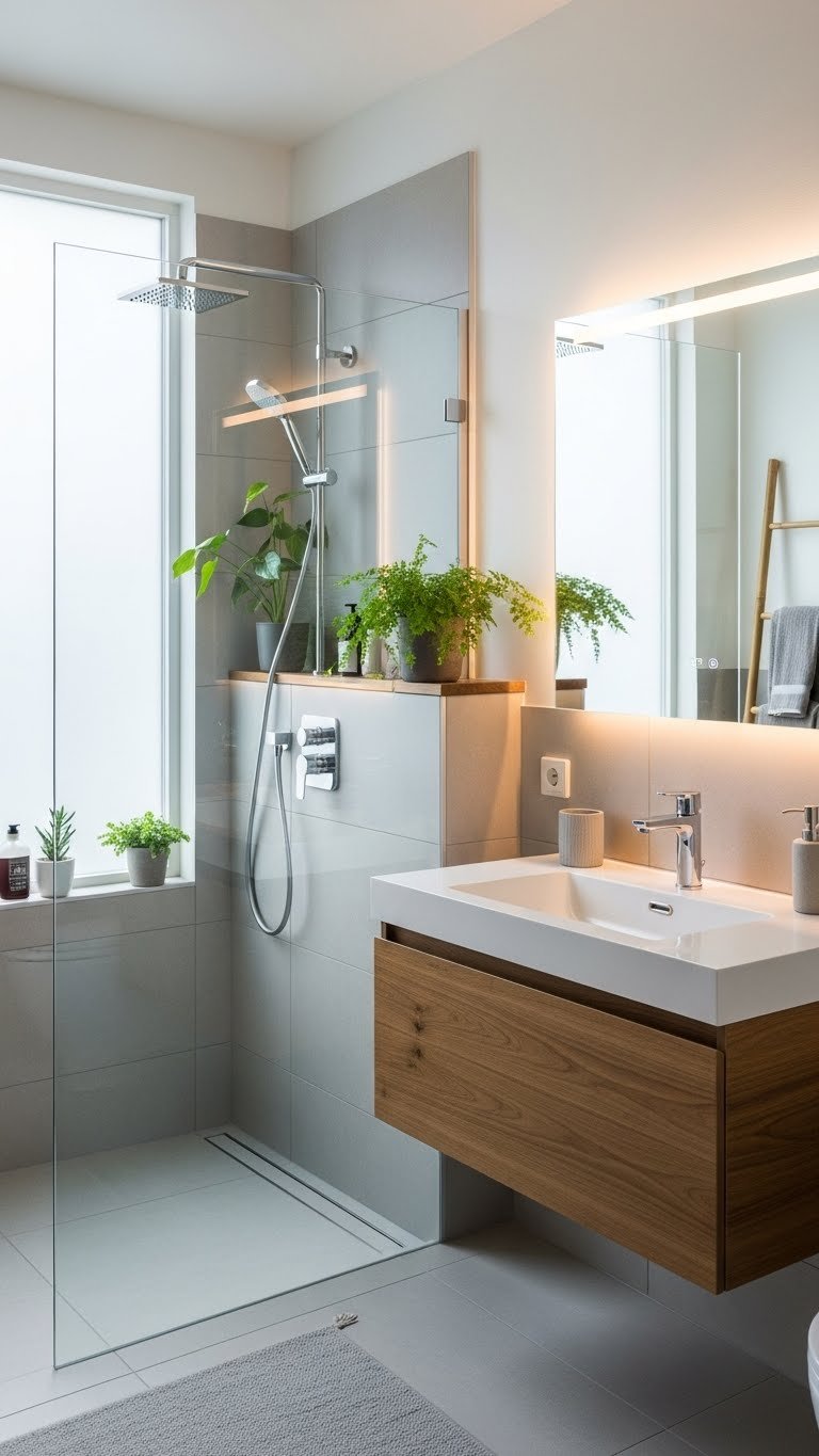 Plants bring life to small spaces, improve air quality, and create a natural, retreat-like feeling. Even tiny bathrooms have room for 2–3 small plants that thrive in humidity.