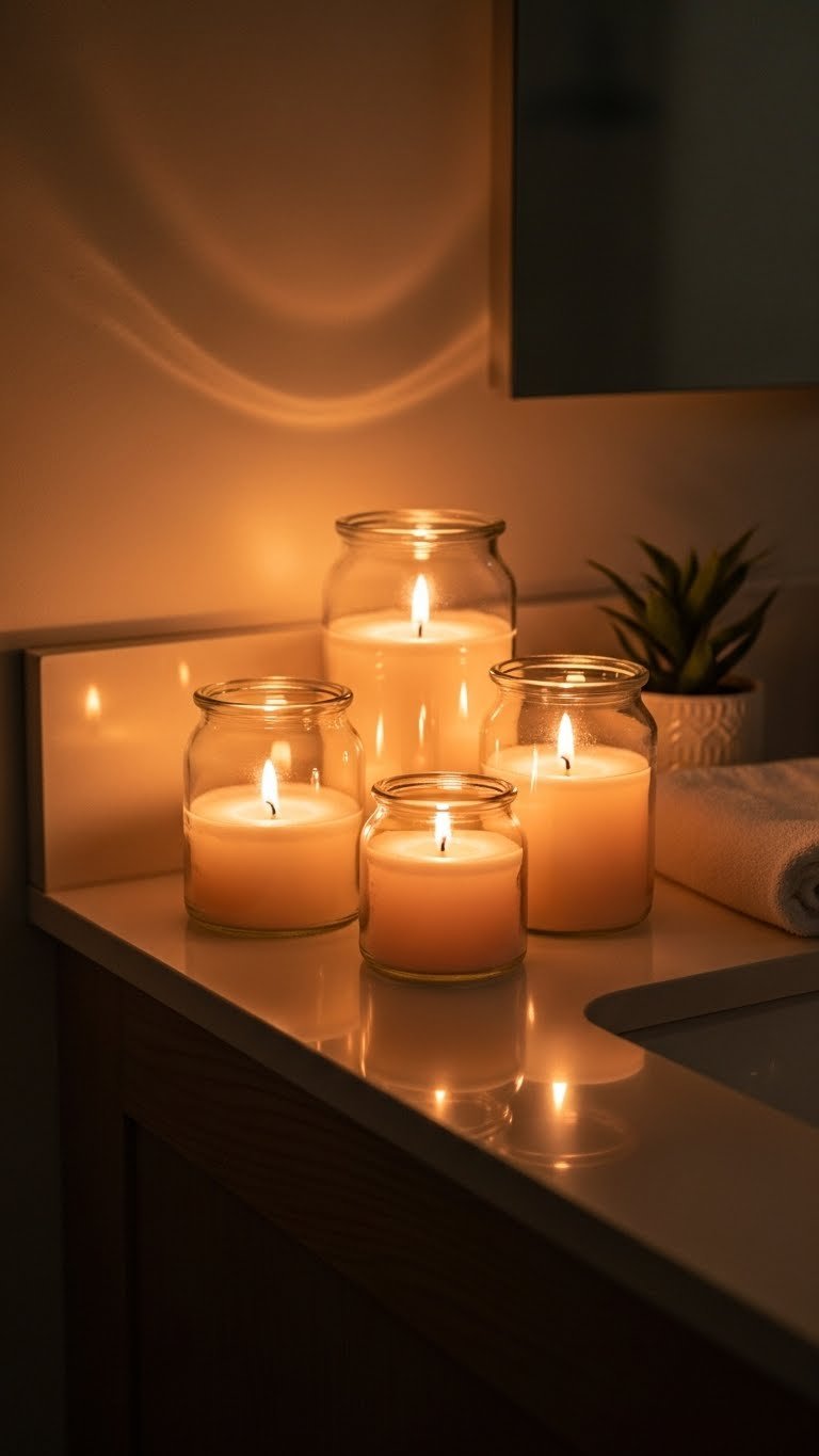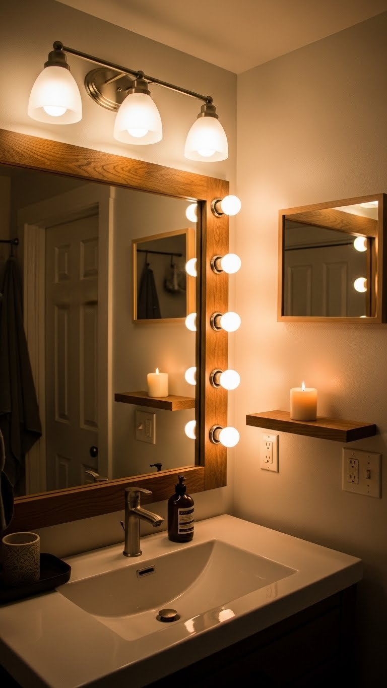 Install a dimmer switch (around $15–$30) on your existing overhead light. Add a mirror light fixture with LED bulbs rated 2700K color temperature for warm light ($40–$150 depending on style). If you have counter space, a small LED candle ($5–$15) or real candle adds final warmth. Most fixtures take 30 minutes to install if you’re comfortable with basic wiring; otherwise, hire an electrician ($75–$150 per hour). Renter? Stick with plug-in options and battery candles.