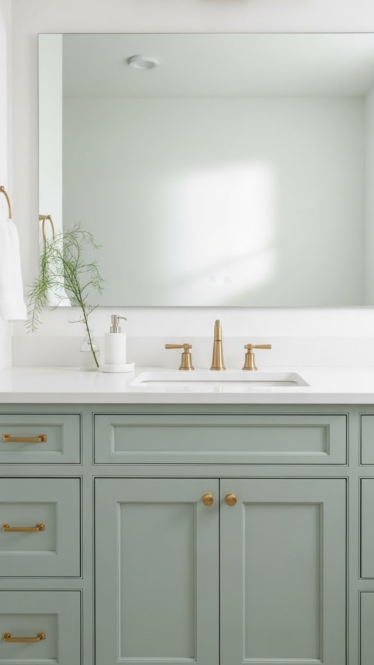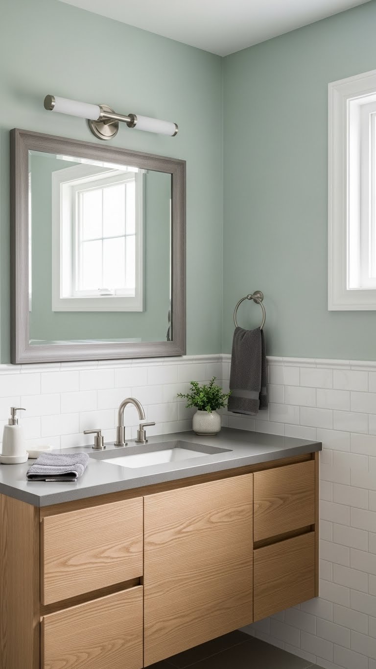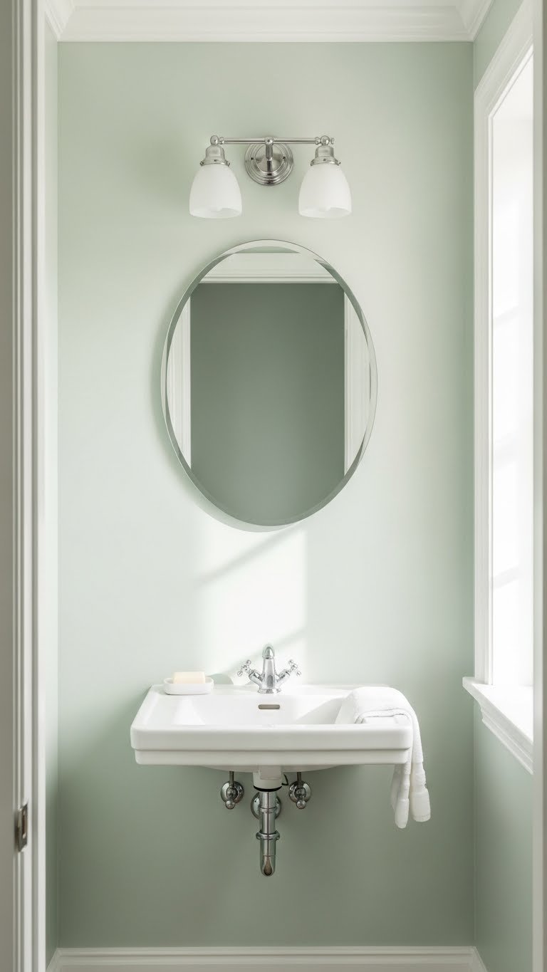 Color is the cheapest way to completely change how a space feels. Light, cool-toned walls (soft sage, pale blue, warm white, or barely-there gray) make even the tiniest bathroom look and feel bigger while creating that calm, retreat-like vibe.