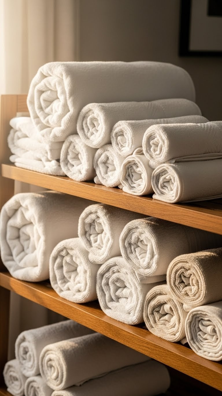 Your bathroom immediately feels warmer and more inviting. Soft textures trigger relaxation, and rolling towels instead of folding them creates that hotel-spa aesthetic that makes daily routines feel special.