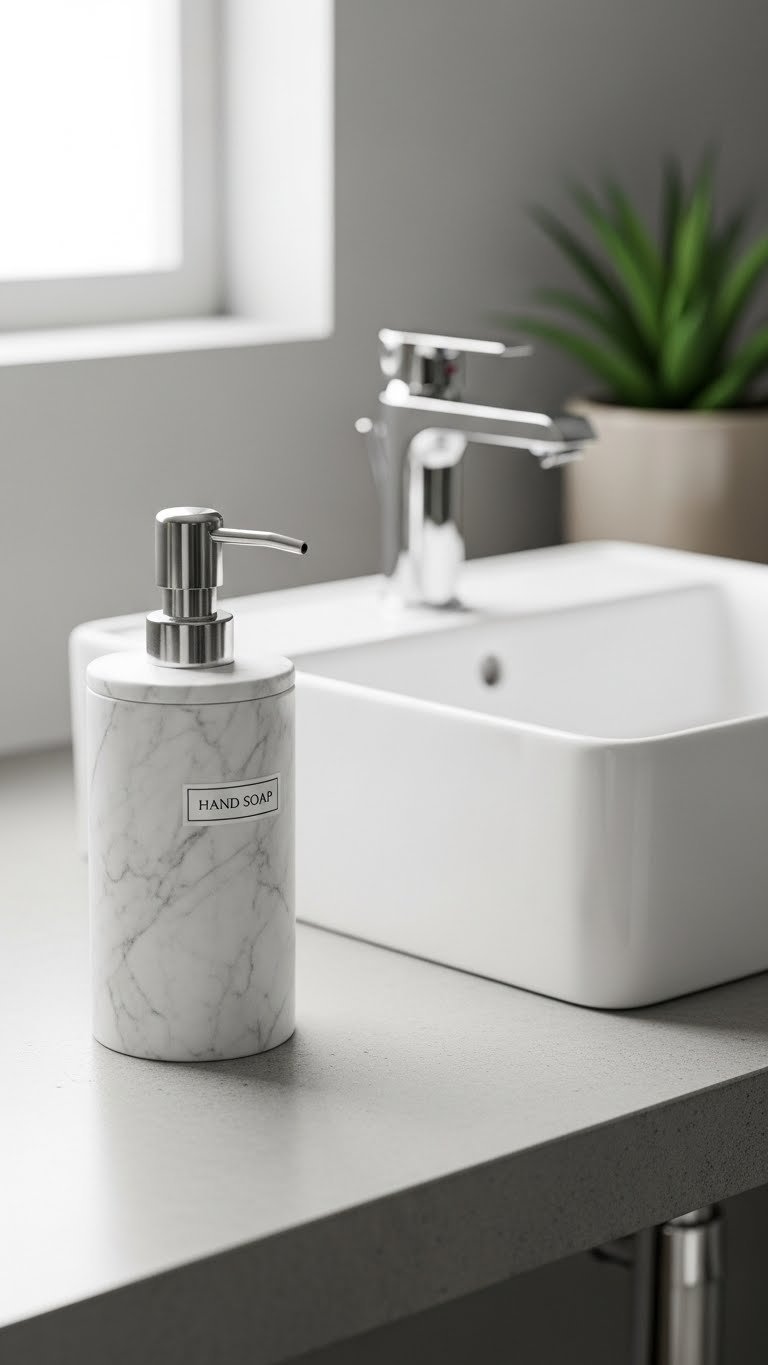A simple tray costs $10–$40 depending on material (brass, wood, ceramic, or marble). Fill it with your essential bottles (transfer to matching pump bottles for cohesion—$8–$15 each), a small candle, and a rolled washcloth. Swap items seasonally. This takes zero installation and works for renters. Target, West Elm, IKEA, and Anthropologie have beautiful options.
