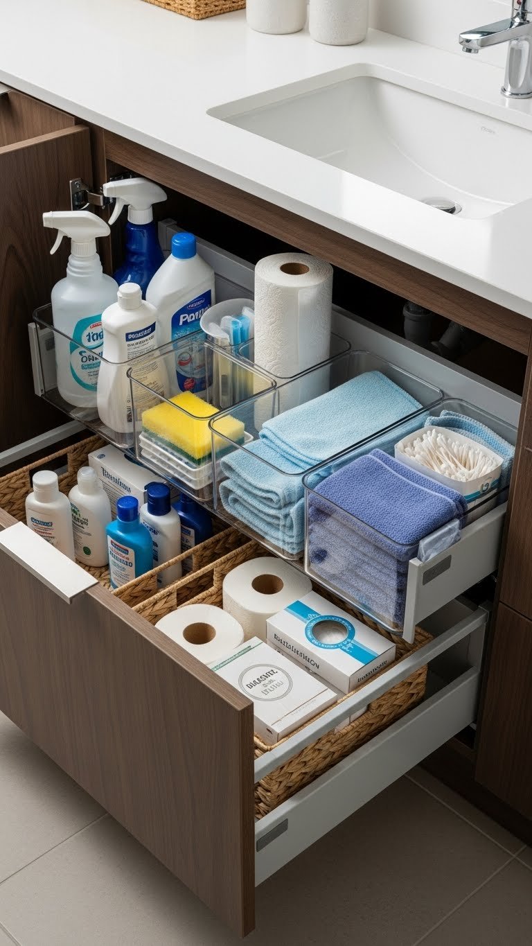 Bamboo or plastic drawer dividers cost $10–$30 for a set. Small containers and bins ($5–$20) corral loose items. This is a weekend project—empty your drawers, sort items into categories, and install dividers. Adjust as needed. Target, IKEA, Container Store, and Amazon have tons of affordable options. Bonus: organized drawers make your bathroom feel bigger because you’re not visually drowning in clutter.
