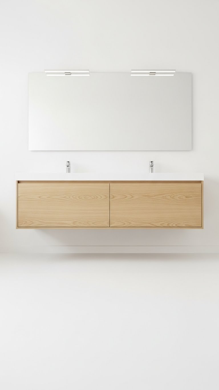 Storage is everything in small bathrooms. Floating cabinets hide clutter while maintaining an open, airy feel—they look like art but function as storage.