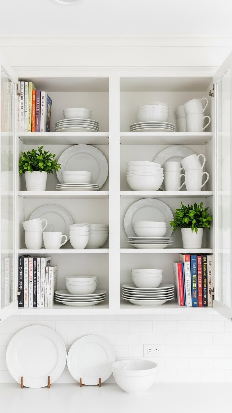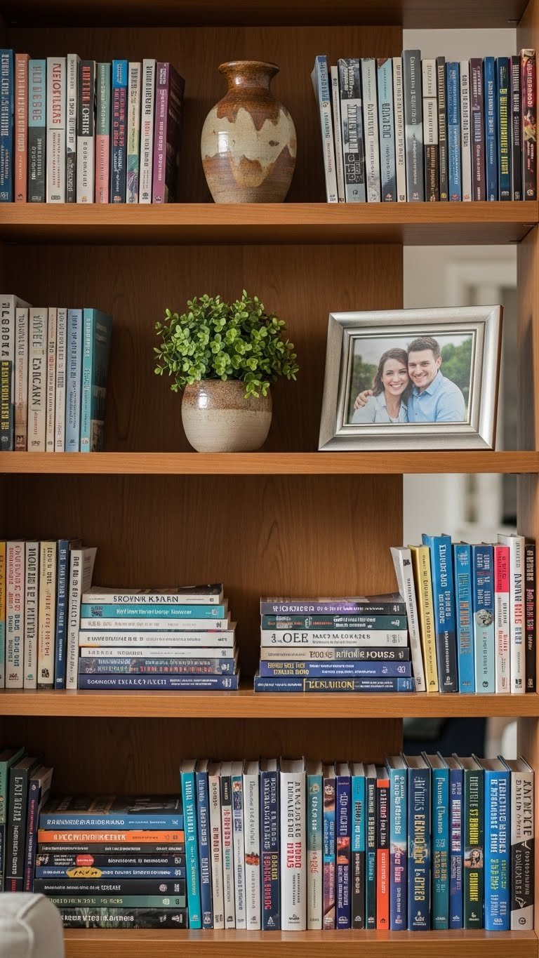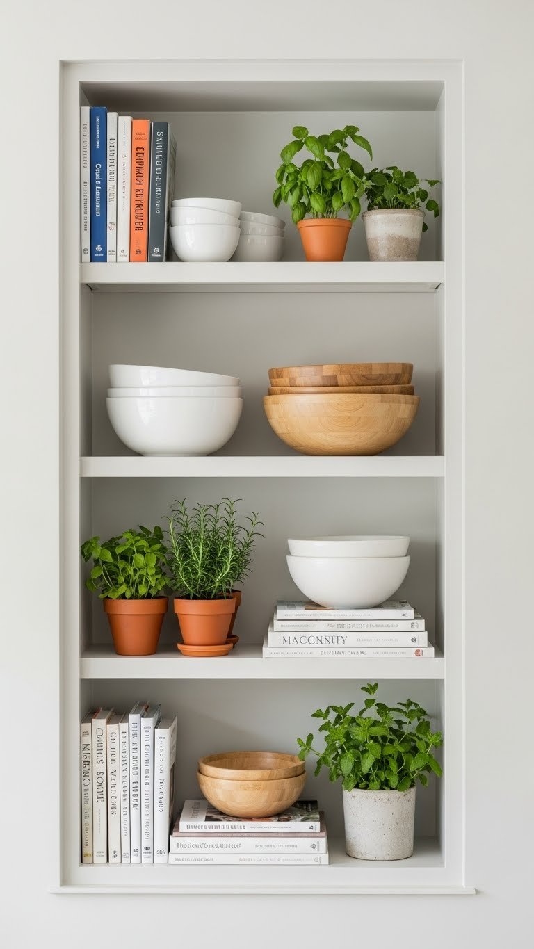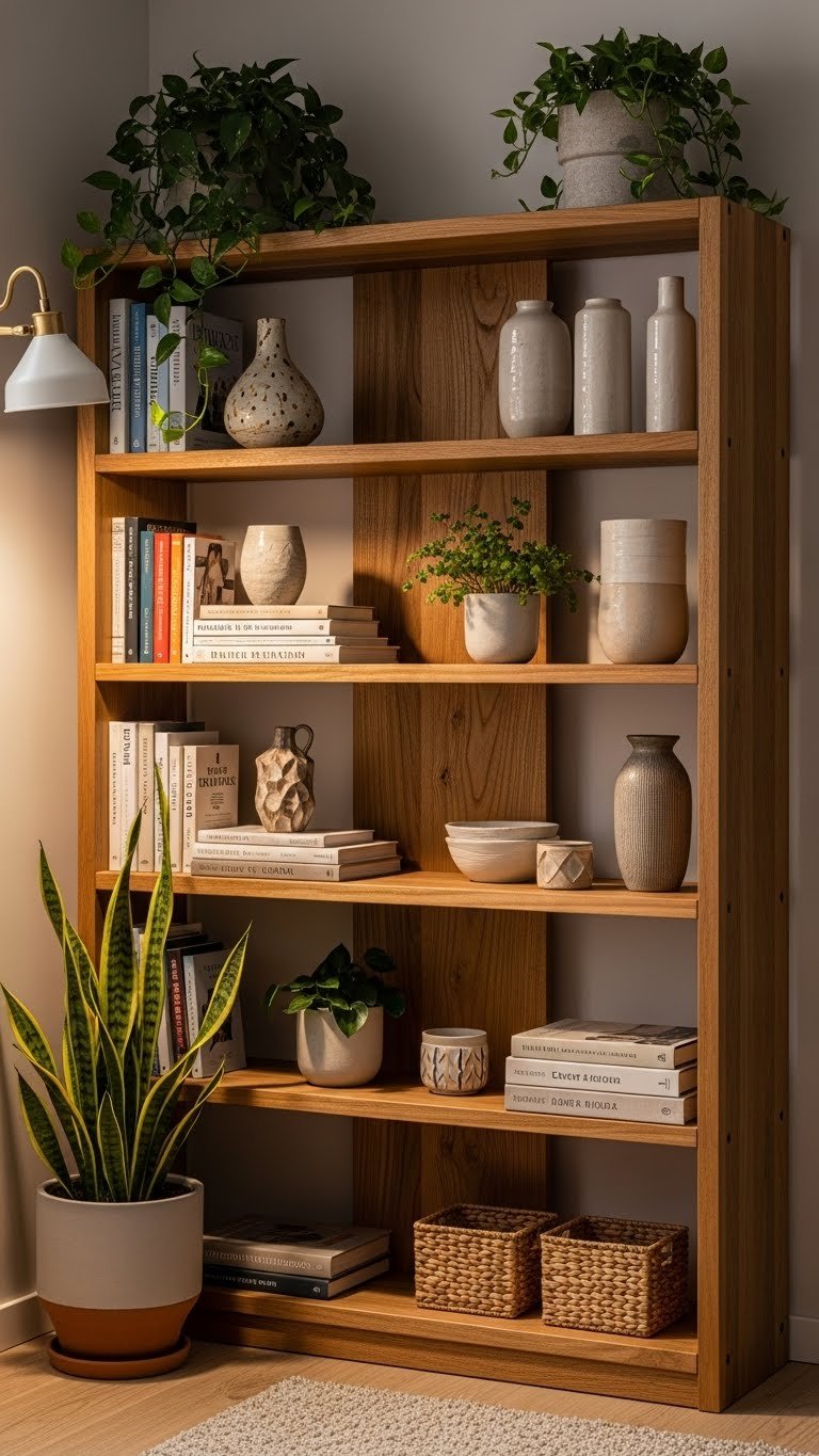 Paint walls a creamy neutral like Benjamin Moore’s Ivory White or Sherwin-Williams’ Alabaster. Install warm wood shelving (or use floating shelves from IKEA for $15–$30 each). Style with your existing books and a few decorative objects in cream, wood, and metal. Paint is $30–$60, and shelving depends on whether you’re building ($100–$400) or using ready-made ($50–$150 for several shelves). This takes a weekend to paint and install.