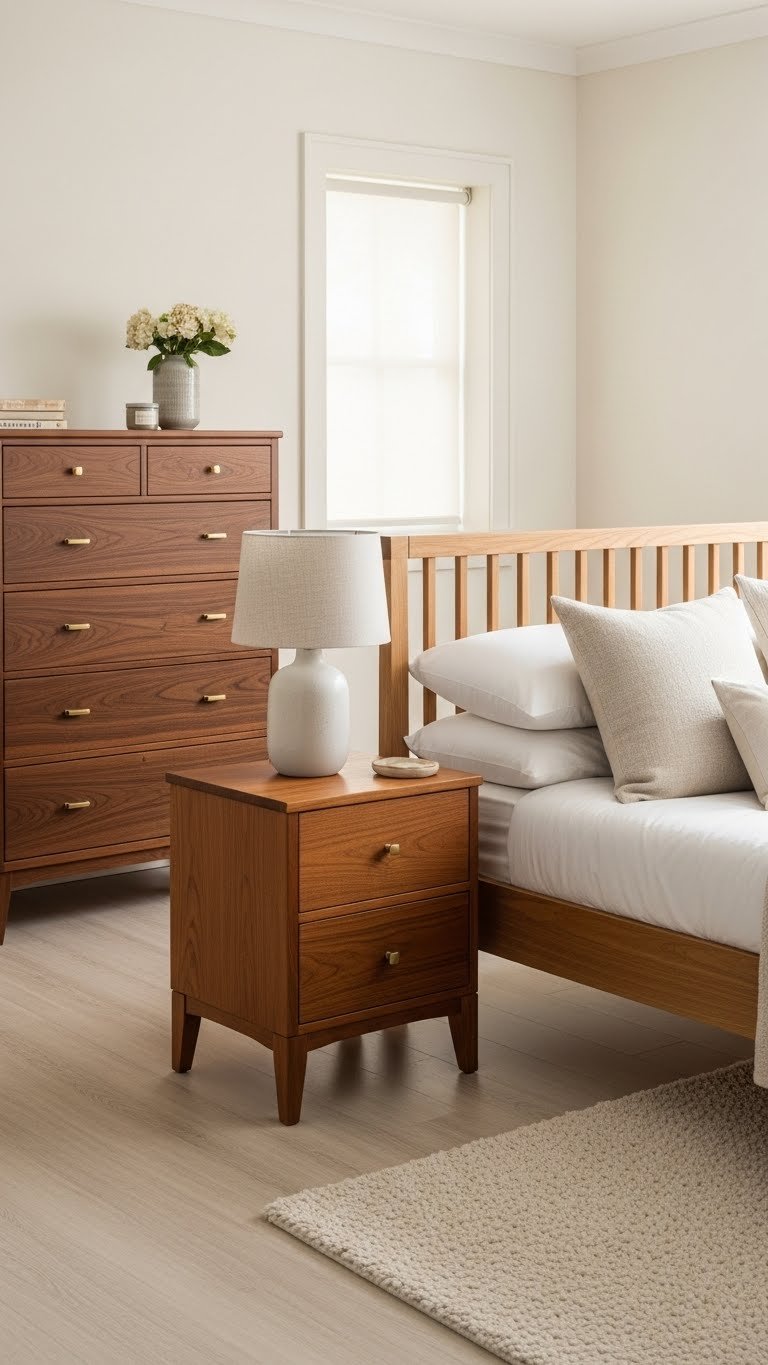 Deep wood paired with cream creates contrast and drama without bold color. The warm lighting ties everything together into a cohesive, inviting space.