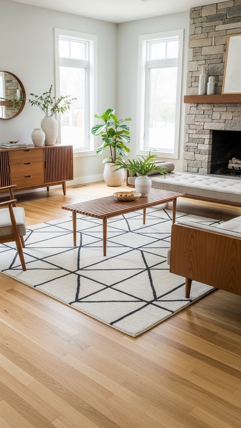 Paint walls a cool white like Benjamin Moore’s Cloud White or Sherwin-Williams’ Alabaster (prioritize the version with cool undertones). Choose gray upholstered pieces and keep wood warm. If you’re refinishing floors, honey or natural tones work best—professional refinishing costs $2–$4 per square foot, but you can achieve similar warmth with area rugs ($50–$300) if you’re renting. Paint is $30–$60. Painting is a weekend; flooring is a larger project best done with professionals.