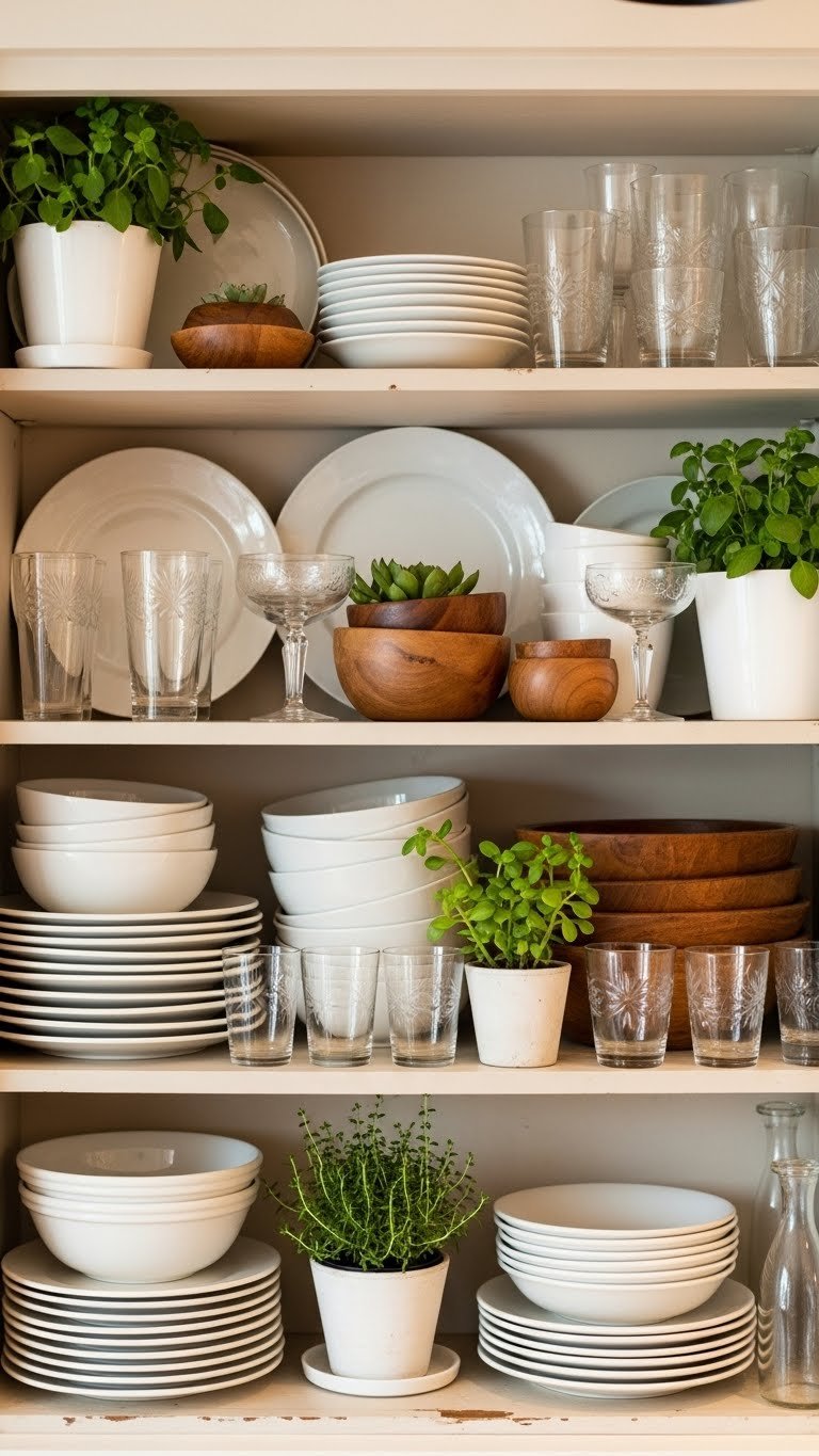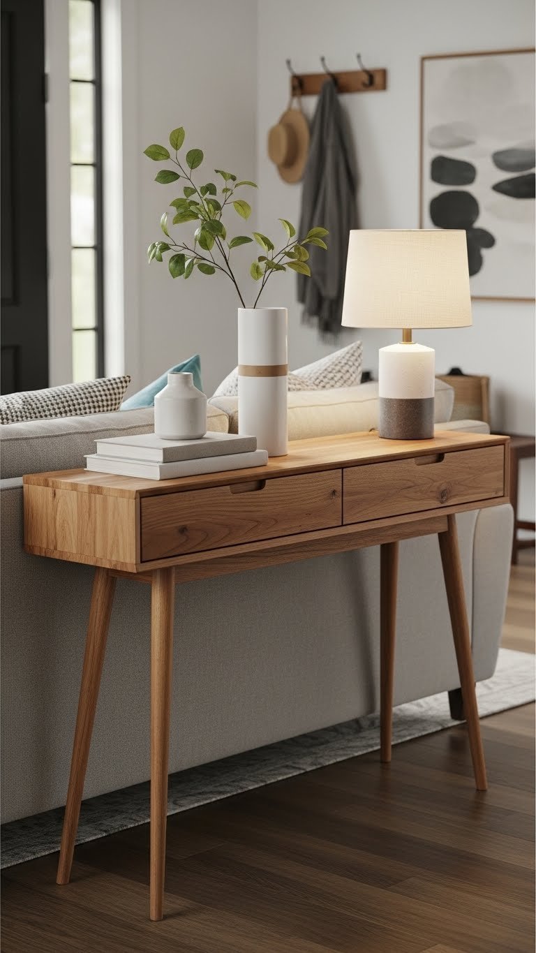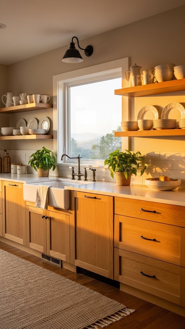 Choose a greige paint like Sherwin-Williams’ Accessible Beige or Farrow & Ball’s String. Keep wood furniture natural and warm-toned rather than whitewashed. Add texture through woven elements—jute rugs, linen curtains, or wooden wall shelving. Paint runs $30–$60 per can, and styling is free if you’re working with what you have. This is a quick weekend project if painting, or instant if you’re just styling.