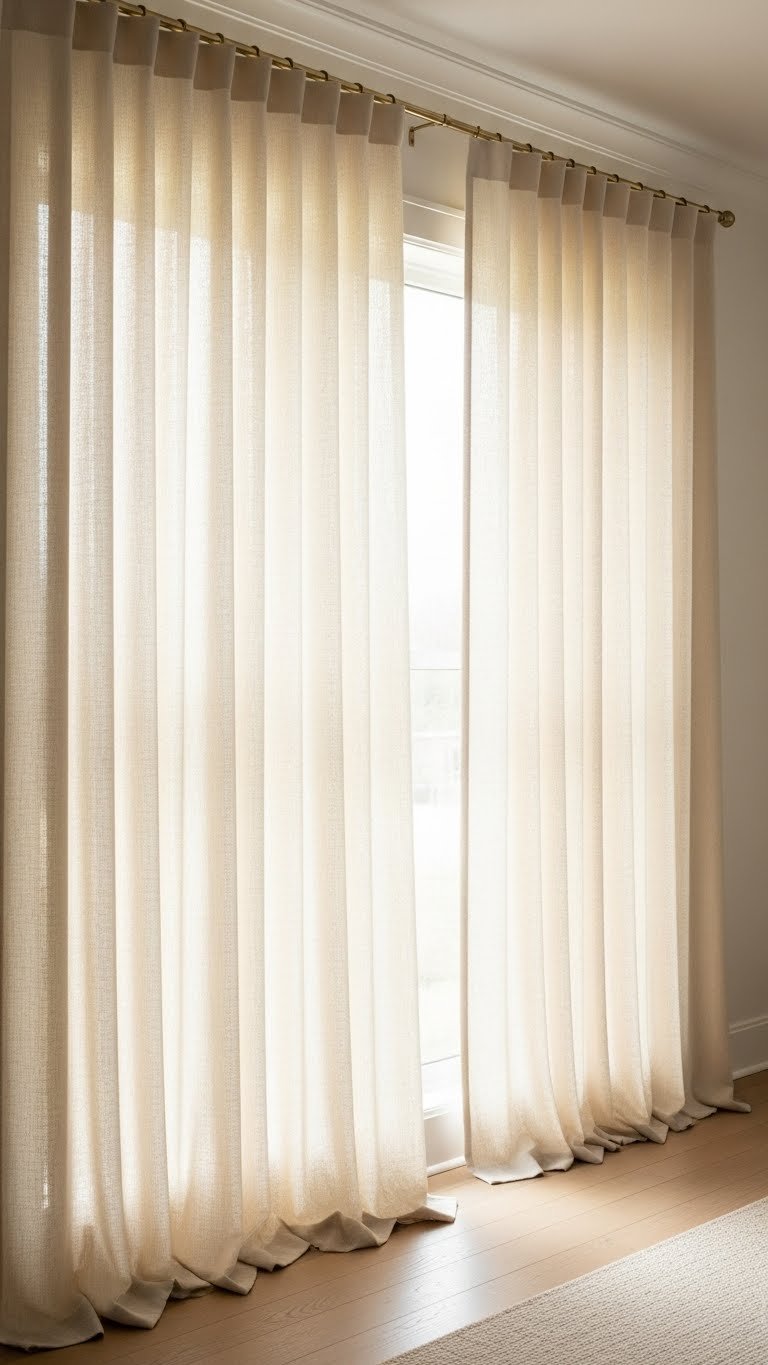 Paint walls pale ivory like Benjamin Moore’s Cloud White or Sherwin-Williams’ Alabaster. If you have existing beams, keep them warm and natural; if you’re adding them, faux wood beams are available as peel-and-stick or lightweight options for $100–$300 per beam. Paint is $30–$60. Hanging curtains is instant; adding beams takes a weekend if DIY or a few hours if hiring help.