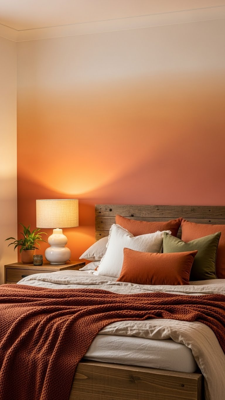 Paint walls a warm greige like Sherwin-Williams’ Accessible Beige or Benjamin Moore’s HC-86 (a warm greige from their Historical Collection). Layer jute rugs ($40–$150), linen bedding ($80–$200), and natural fiber throws ($30–$80) from Target, West Elm, or Wayfair. Add a wooden bed frame and simple wood shelving. Paint is $30–$60. Styling this takes an afternoon; painting takes a weekend.