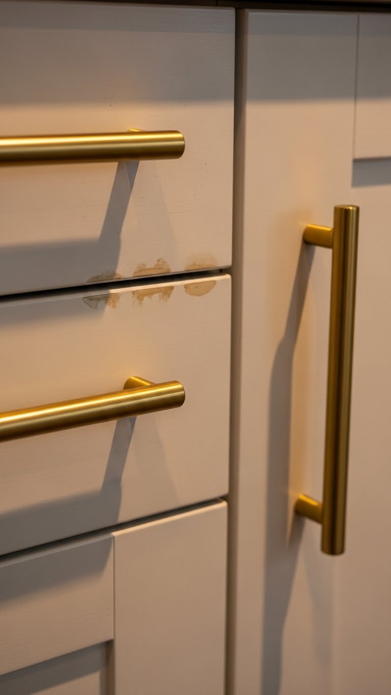 Paint walls a pale greige like Benjamin Moore’s Revere Pewter or Sherwin-Williams’ Urbane Gray. Source brass fixtures and hardware from Anthropologie, Schoolhouse, or even Home Depot for $30–$150 depending on how many pieces you’re replacing. Paint is $30–$60. Replacing fixtures takes a few hours if you’re handy, or budget a plumber visit ($150–$250). This is a weekend project if DIY, or a half-day if hiring help.