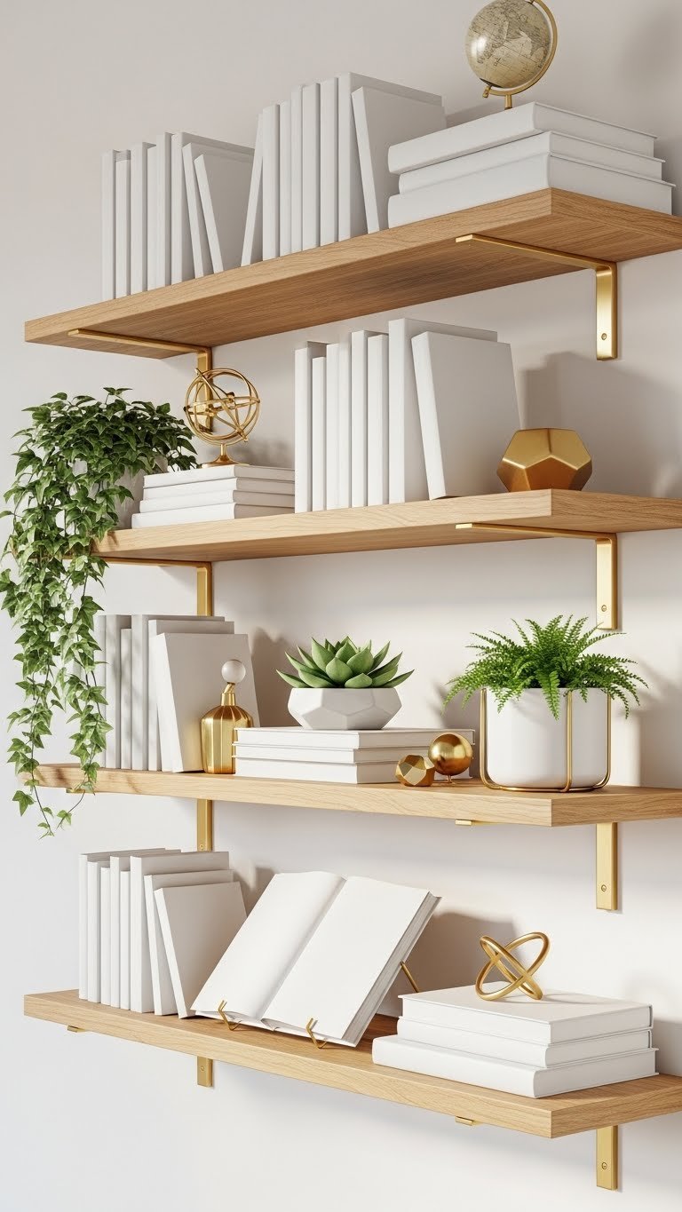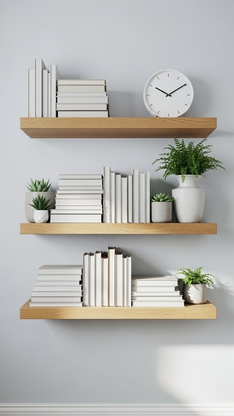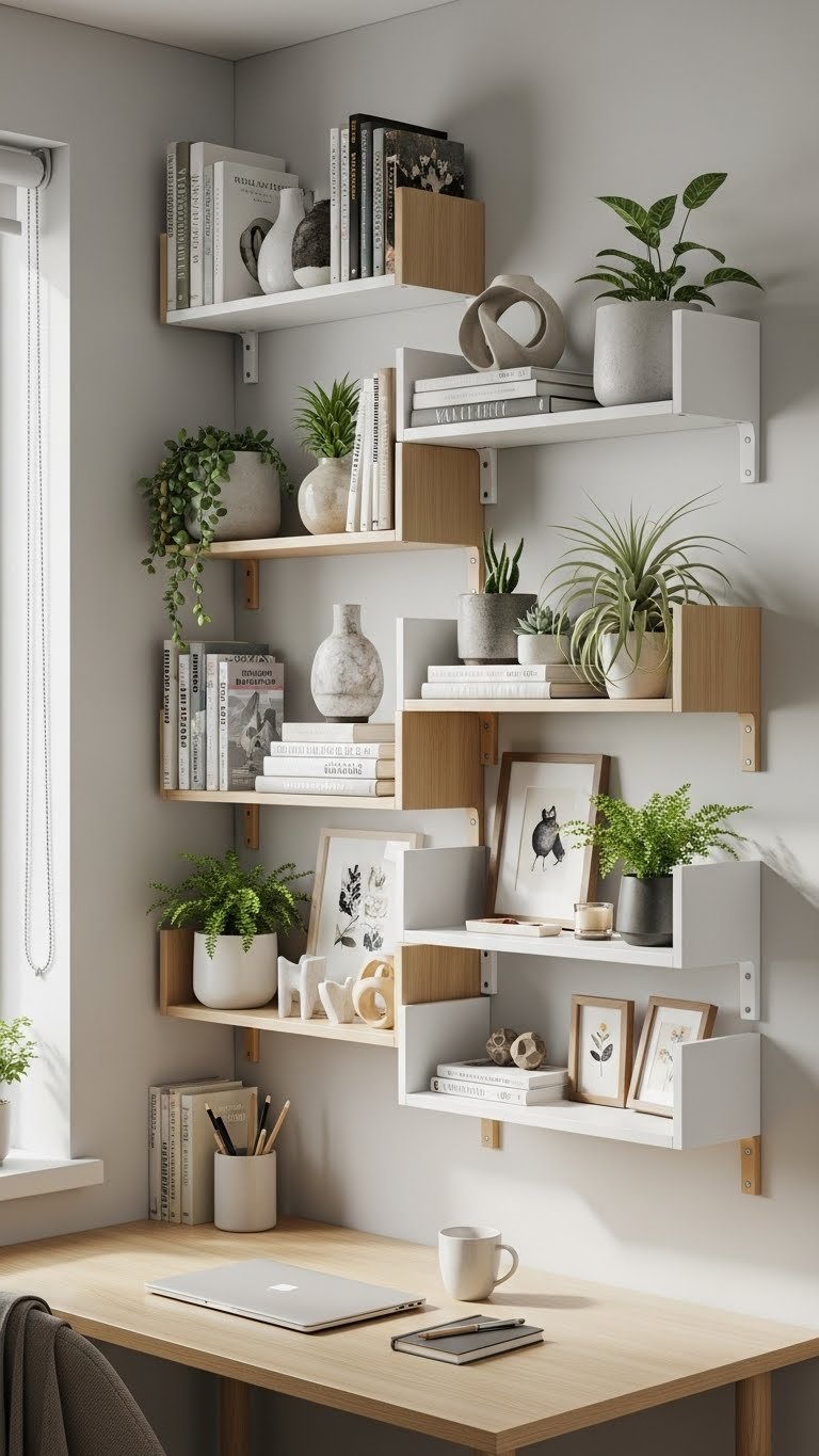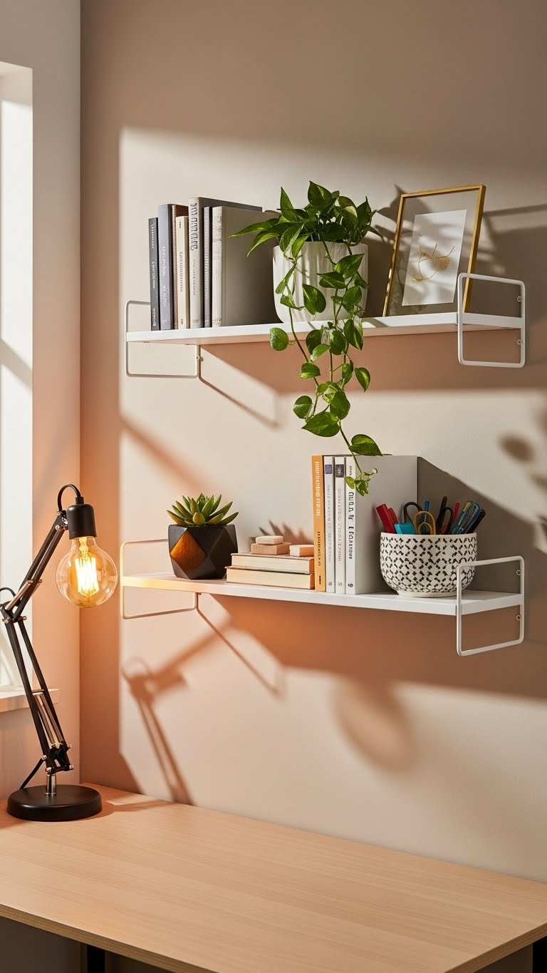 Floating shelves pull your storage upward instead of outward, making tiny rooms feel bigger. You’ll use every inch of vertical space without the bulk of traditional cabinets.