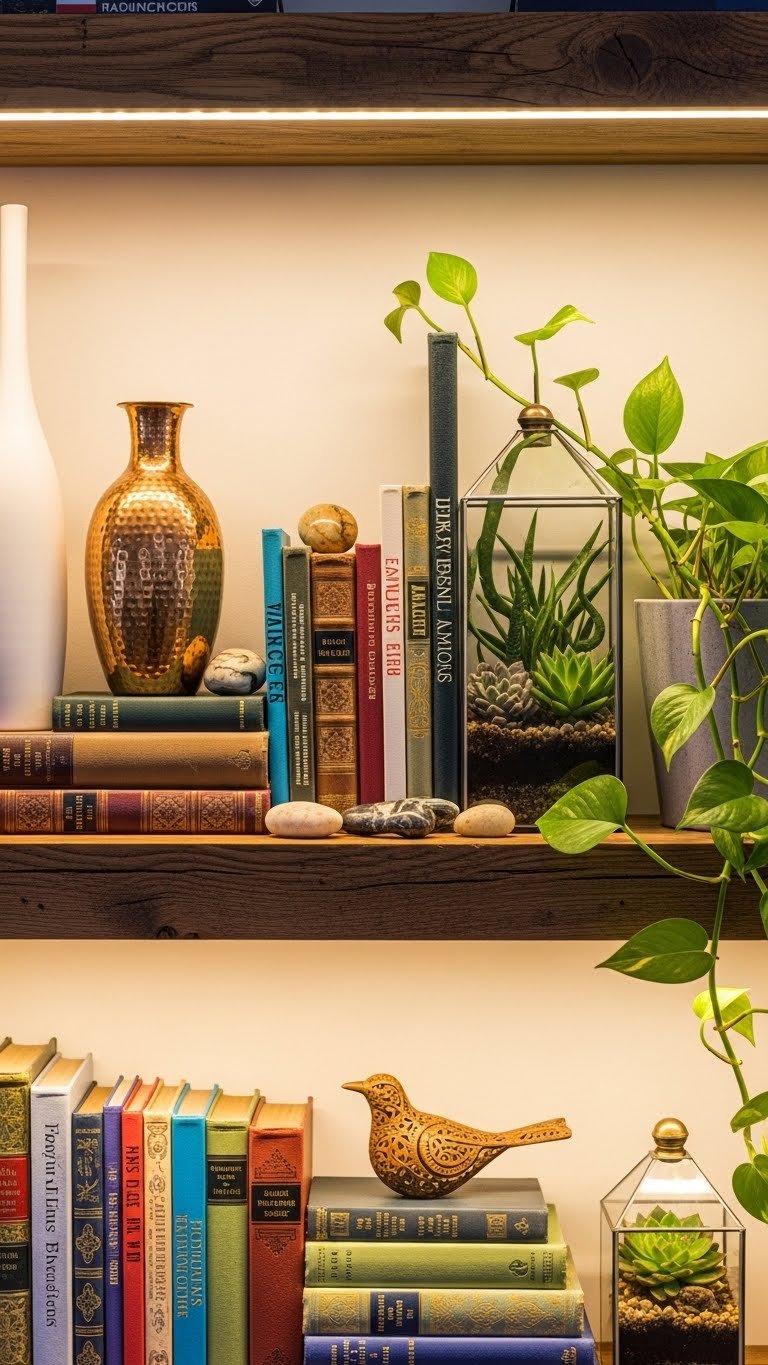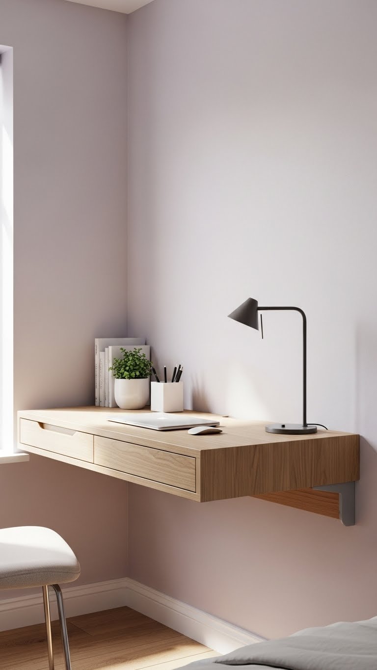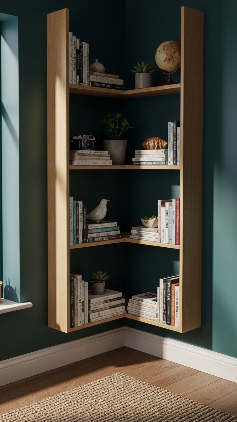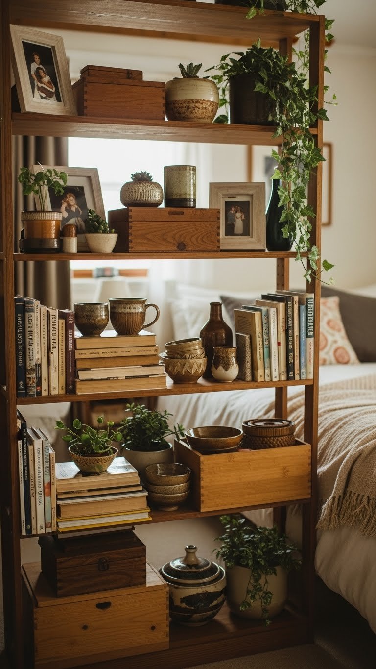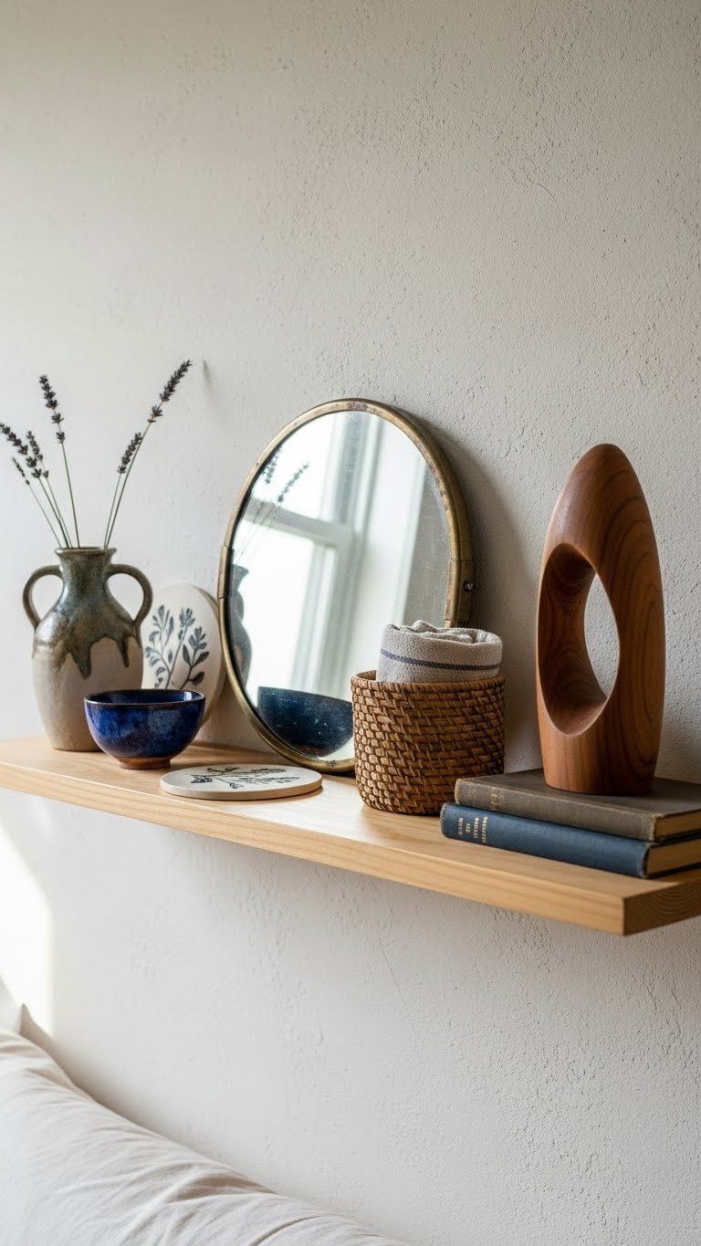 Floating shelves pull your storage upward instead of outward, making tiny rooms feel bigger. You’ll use every inch of vertical space without the bulk of traditional cabinets.