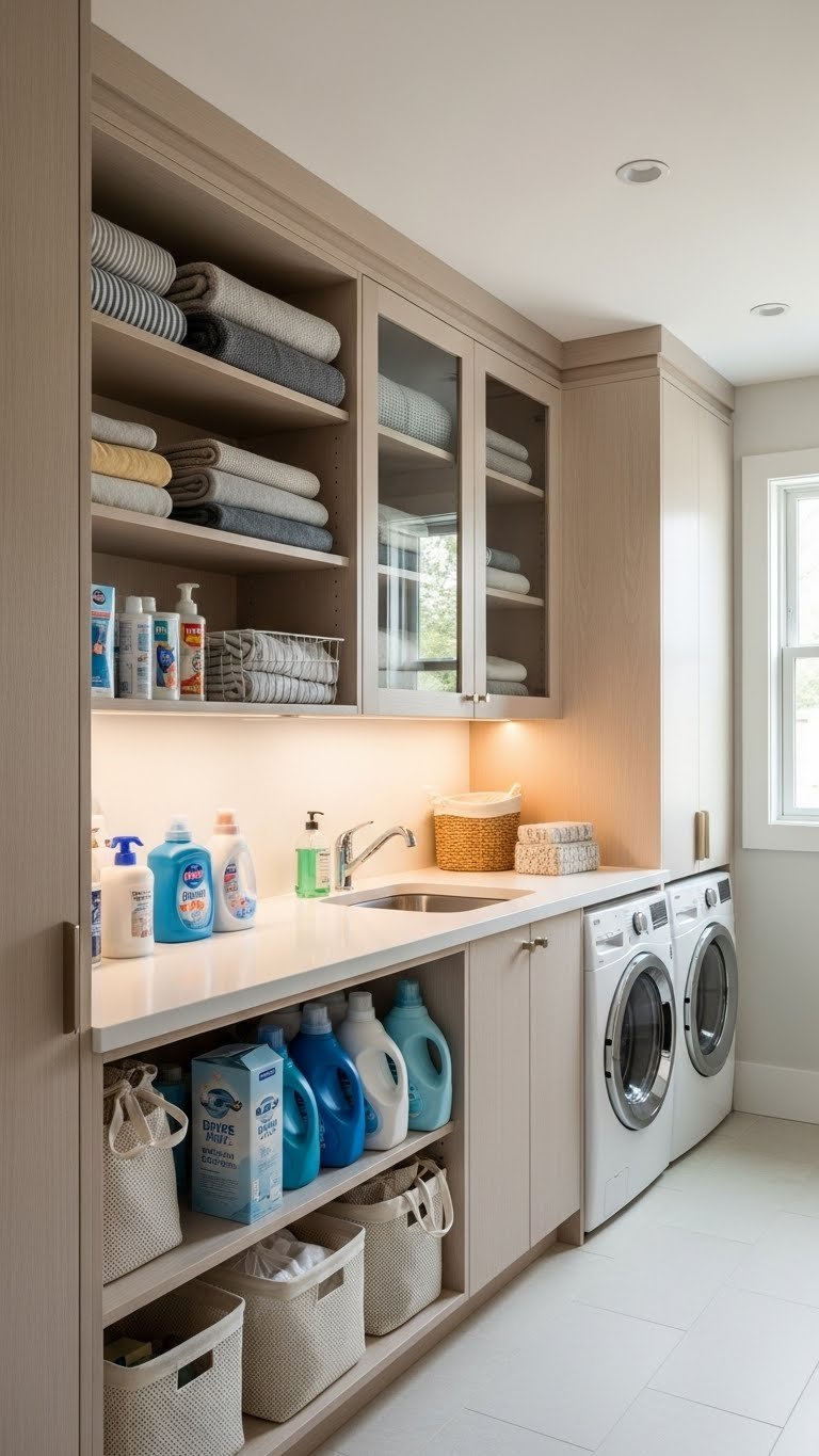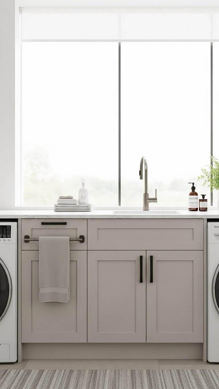 Ditching stark white for earthy tones instantly changes the room’s energy. Soft greens, warm grays, and muted blues make chores feel less tedious.
