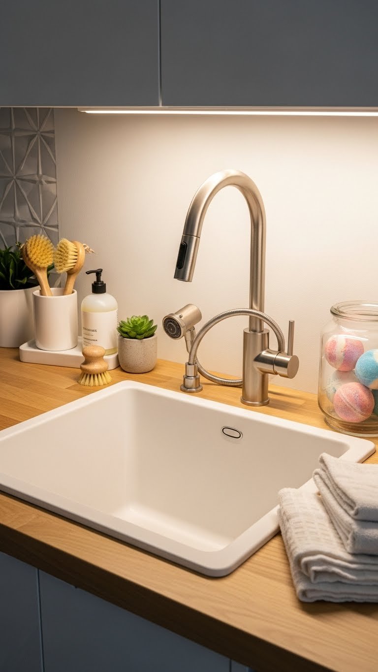 A utility sink is one of the best upgrades for serious laundry care. You can pre-soak delicates, treat stubborn stains, and hand-wash items right where you need them.