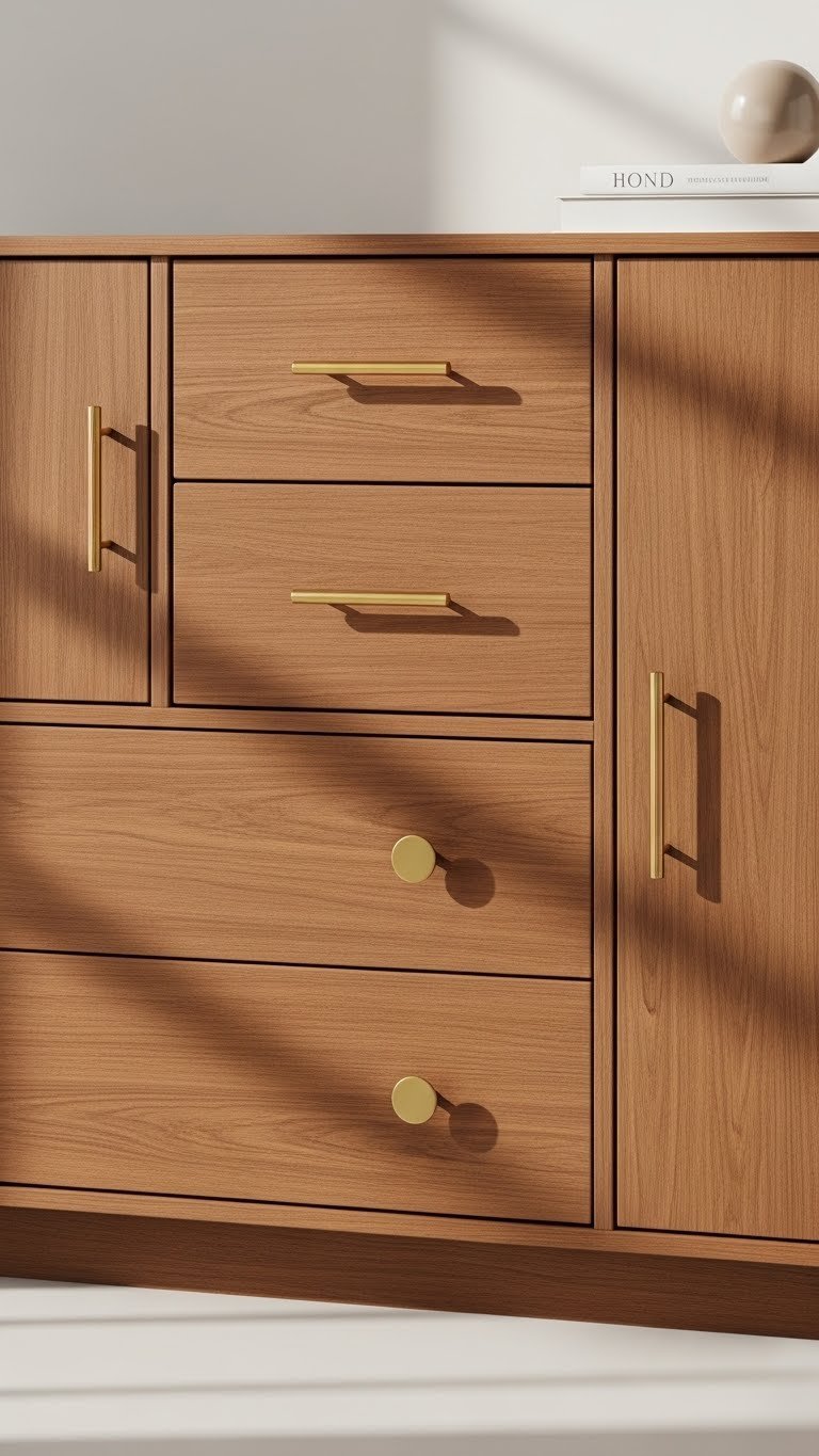 Updating hardware to mix finishes costs $50–$150 total. You’re simply swapping out existing pieces with new ones in different finishes. This is a 2–3 hour weekend project. The metals to combine: brushed gold, brushed nickel, matte black, and stainless steel all work together.