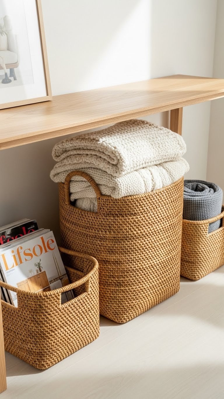 Matching baskets create visual calm while keeping categories separate. Labels ensure everyone finds what they need without creating chaos.