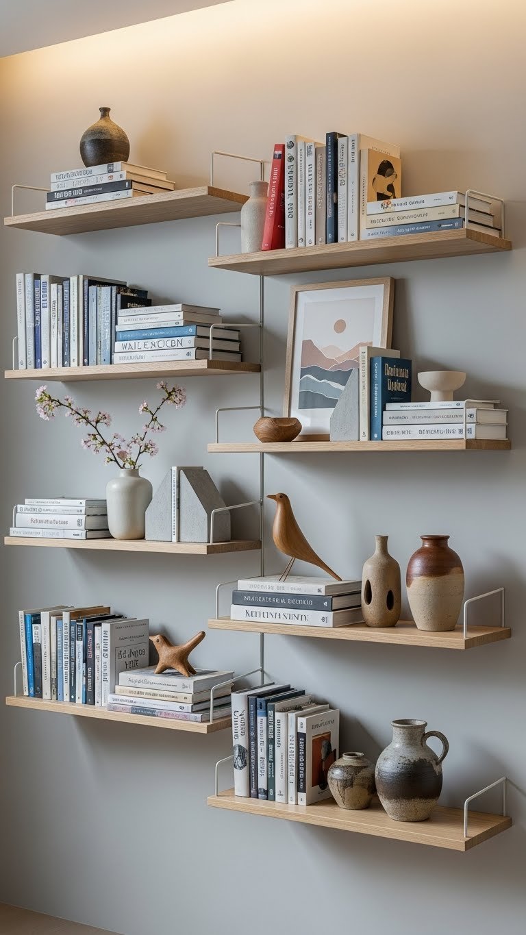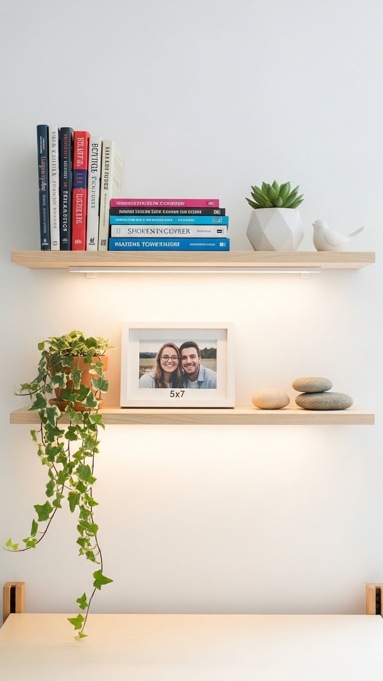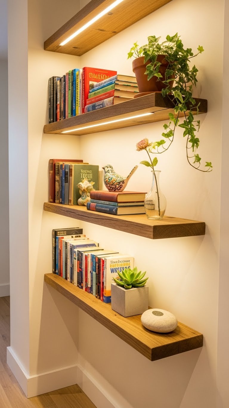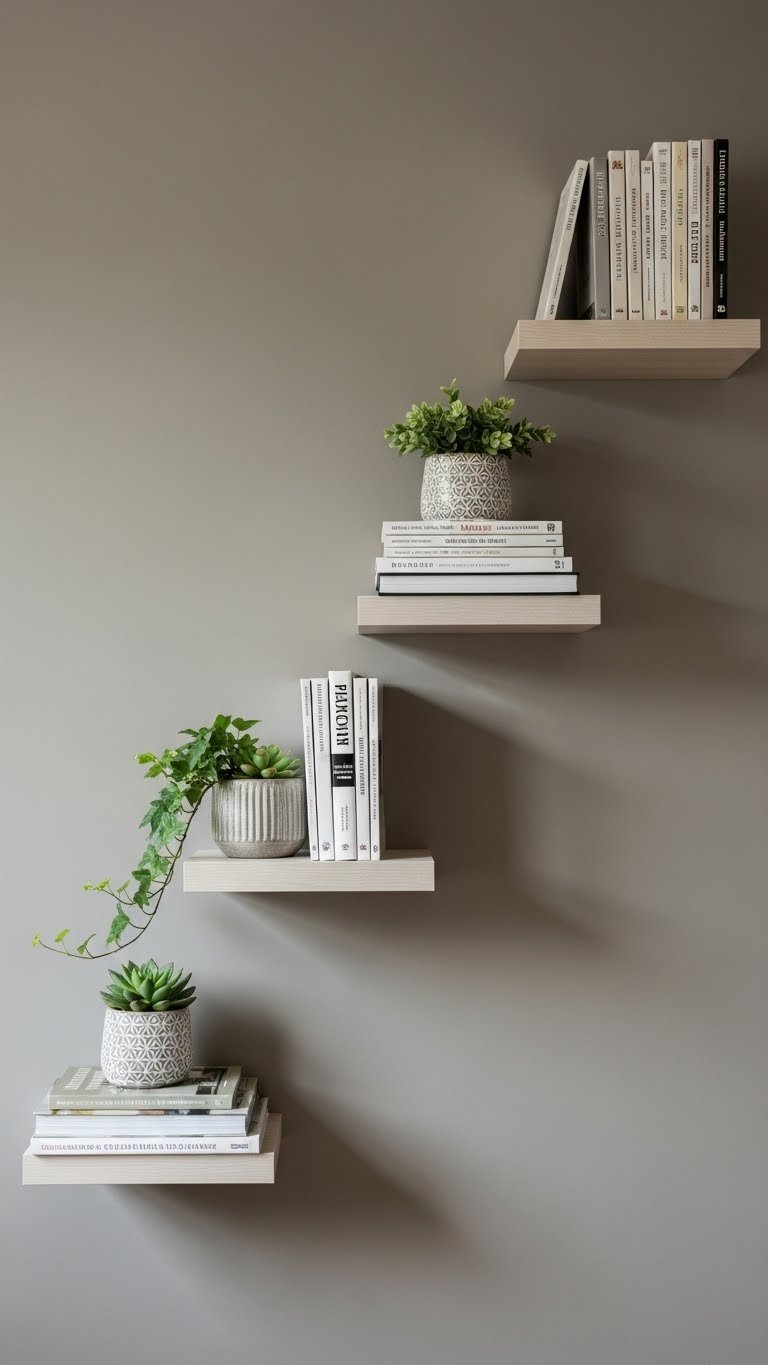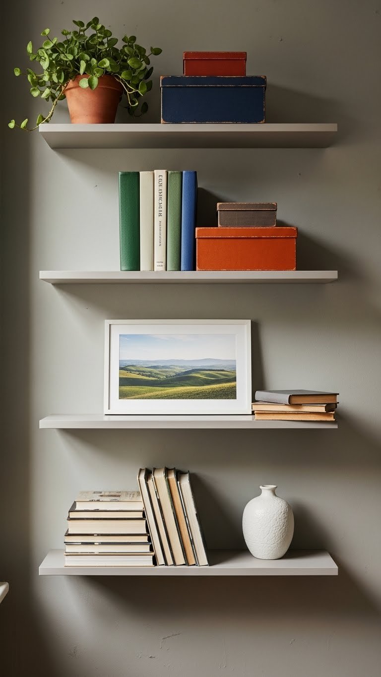 Mount 2–4 floating shelves at varying heights on an empty wall using a level and wall studs (or toggle bolts for drywall). Shelves cost $20–$80 each, and installation takes 1–2 hours if you’re comfortable with basic tools—otherwise, ask a handyperson ($50–$100 labor). Find shelves at IKEA, Home Depot, or Amazon. Fill them with books, plants, and a few meaningful objects to create visual interest without clutter.