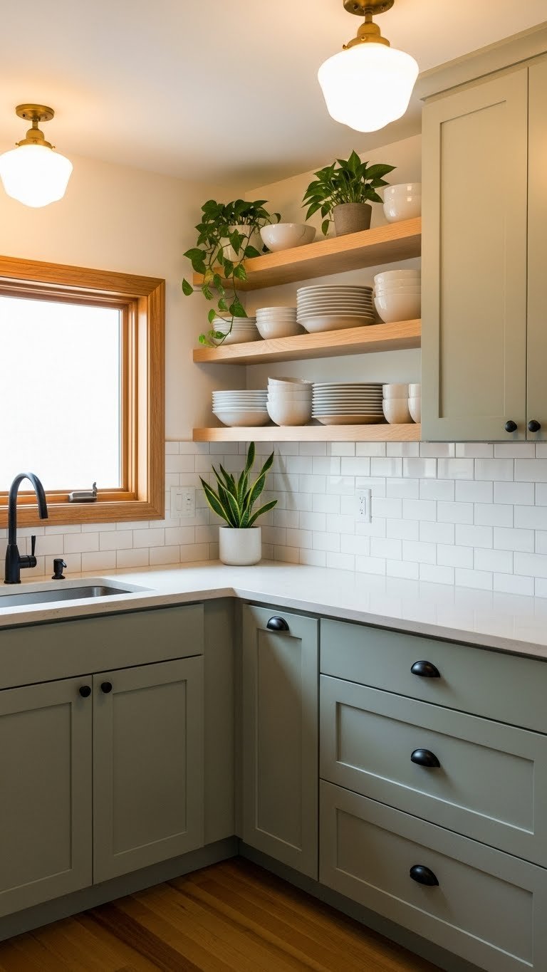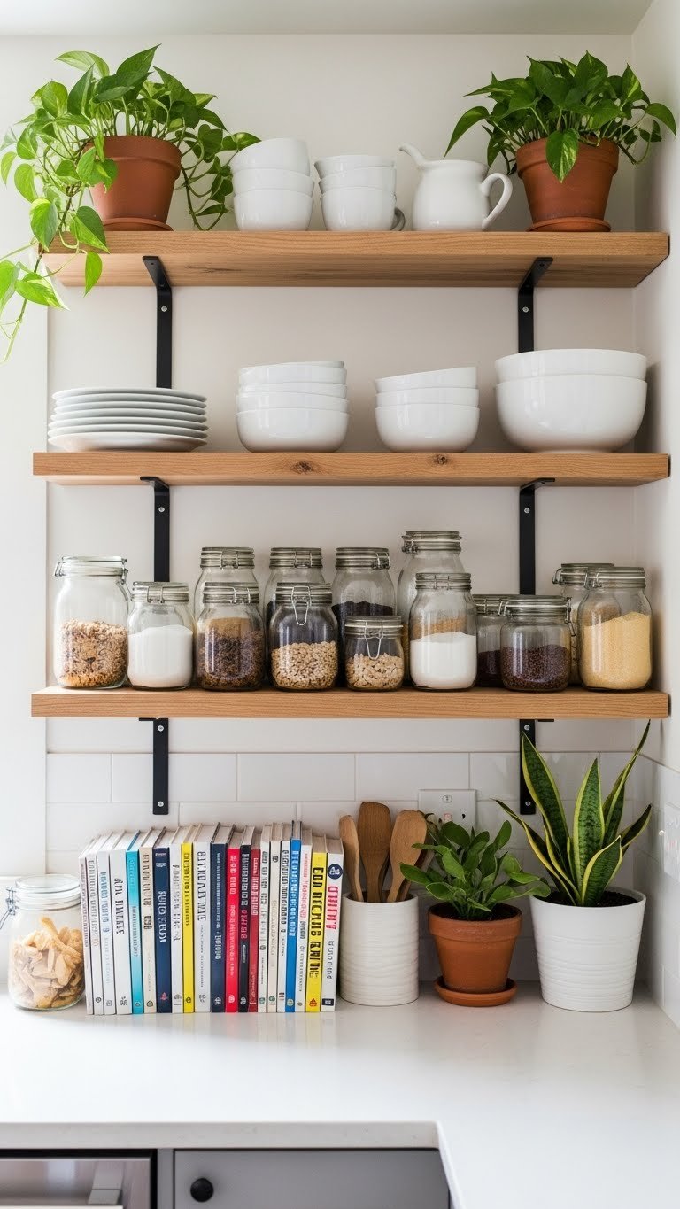 Mount 2–3 open shelves using sturdy brackets (black, brass, or natural wood) for $30–$80 total. Installation takes 1–2 hours with a drill and level. Fill shelves with beautiful everyday items: white dishes, glass jars for dry goods, cookbooks, and a few green plants. Budget an extra $20–$50 for styling items if needed. Pro tip: Keep shelves at 80% capacity so they don’t look cluttered or overwhelming.