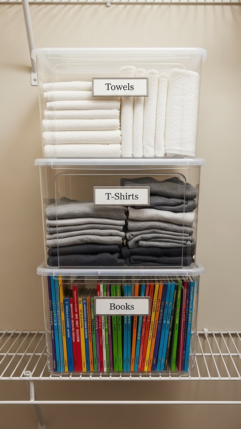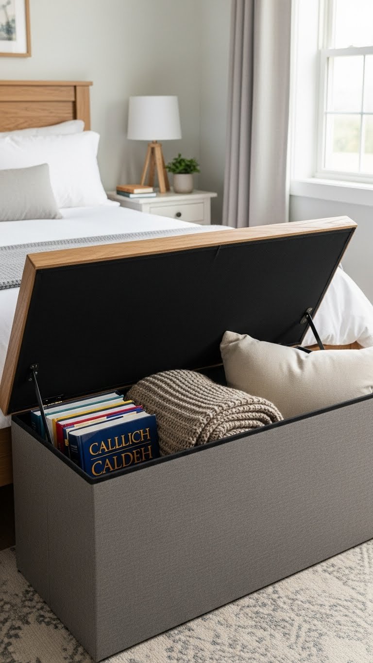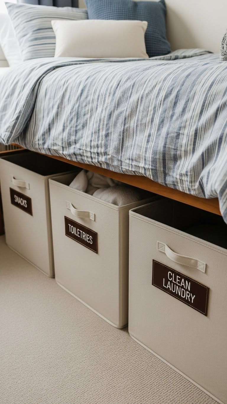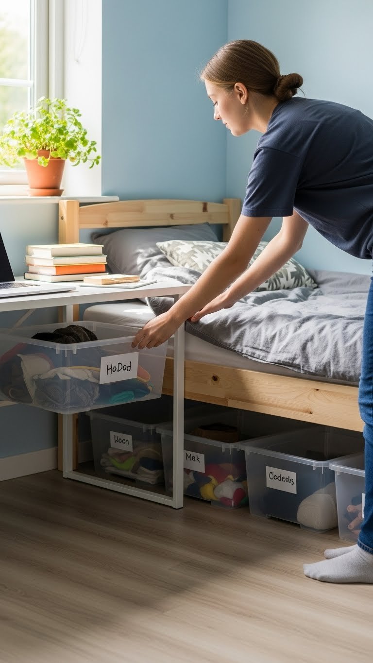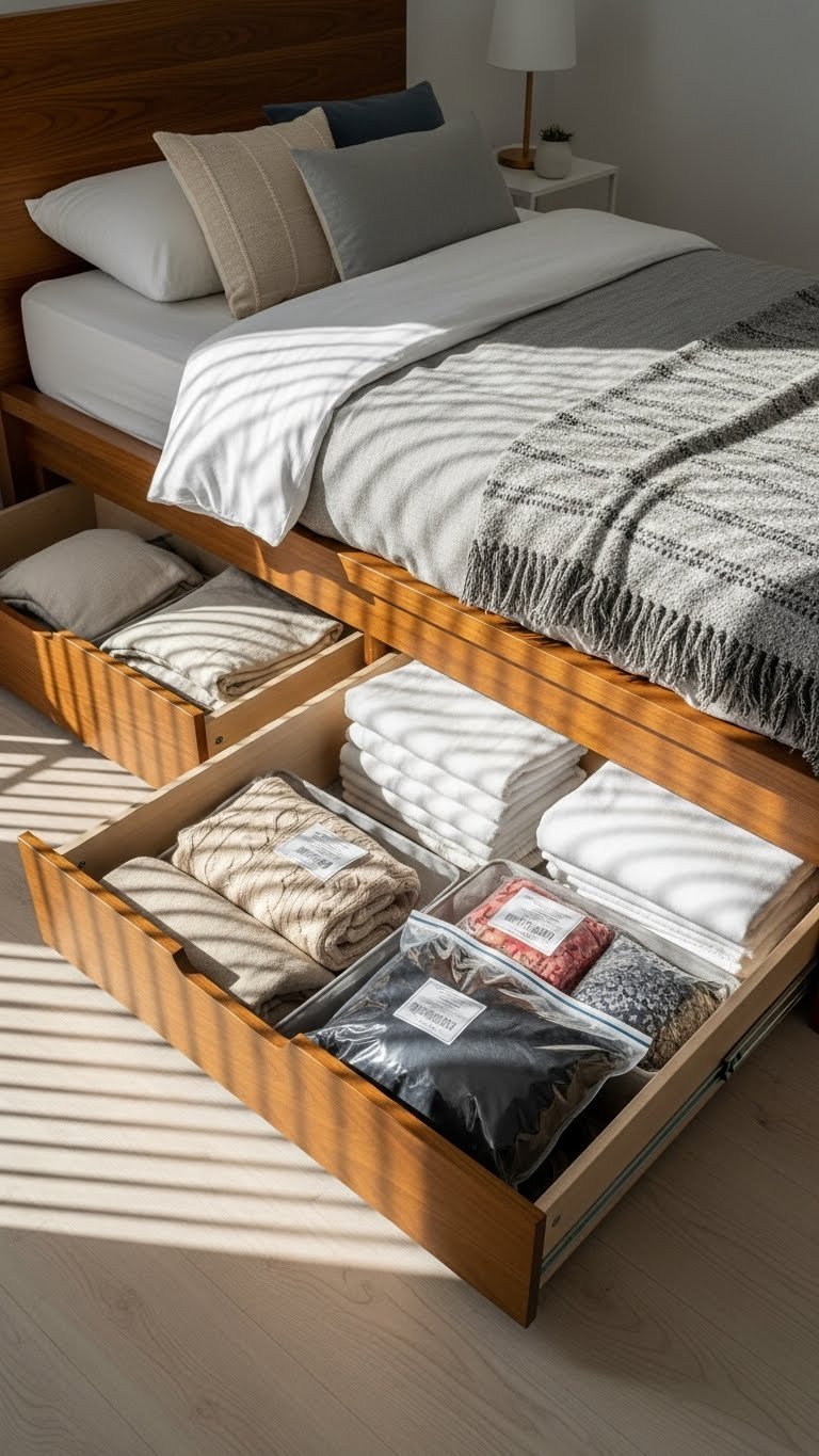 Buy under-bed storage containers or rolling drawers (look for ones with wheels for easy access). Budget $30–$100 for a set of 2–3 from IKEA, Target, or Amazon. Installation takes 15 minutes—just slide them under your bed. Fill with off-season clothes, extra bedding, or items you don’t use daily. Pro tip: Label containers so you know what’s inside without opening them.