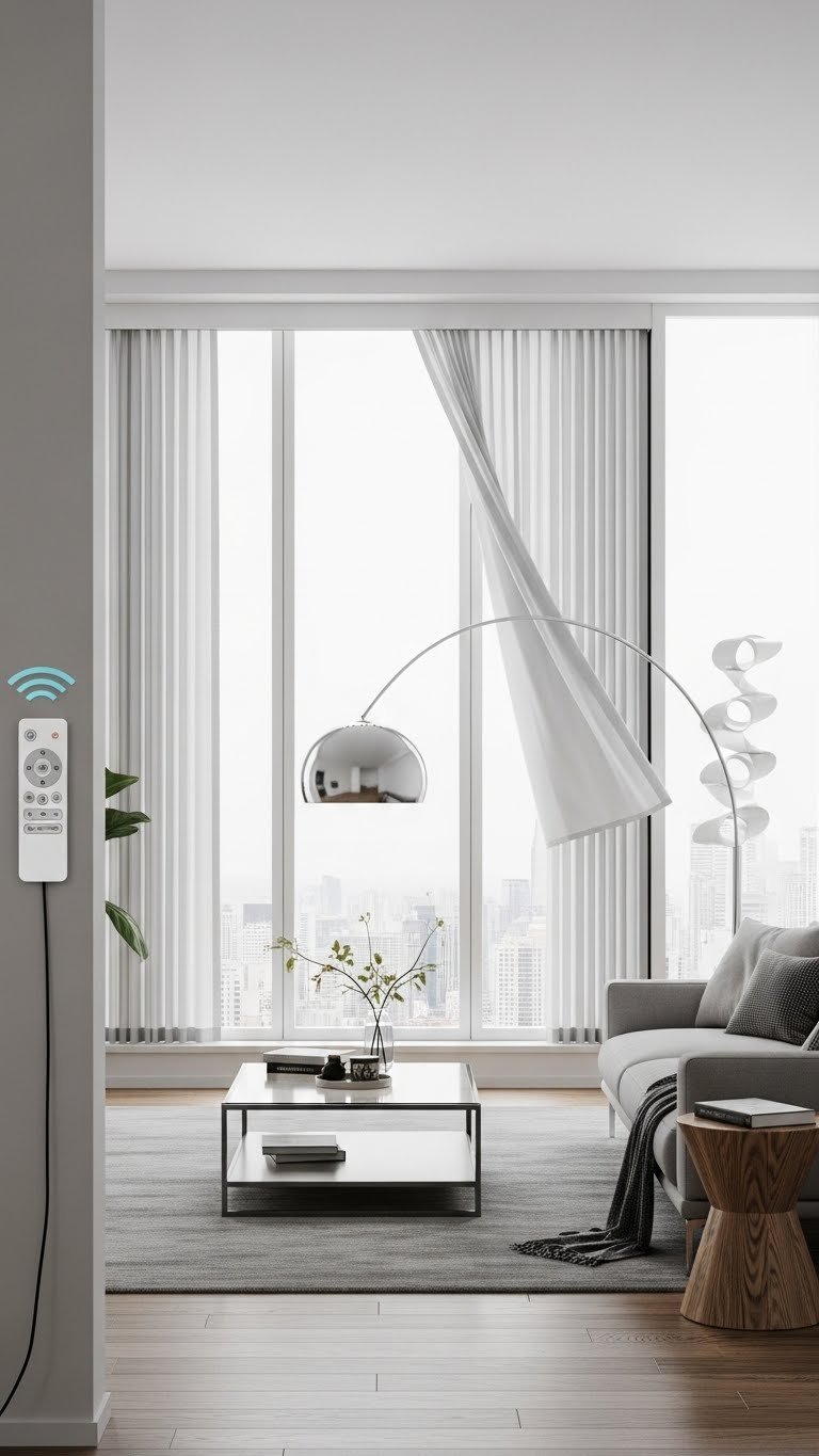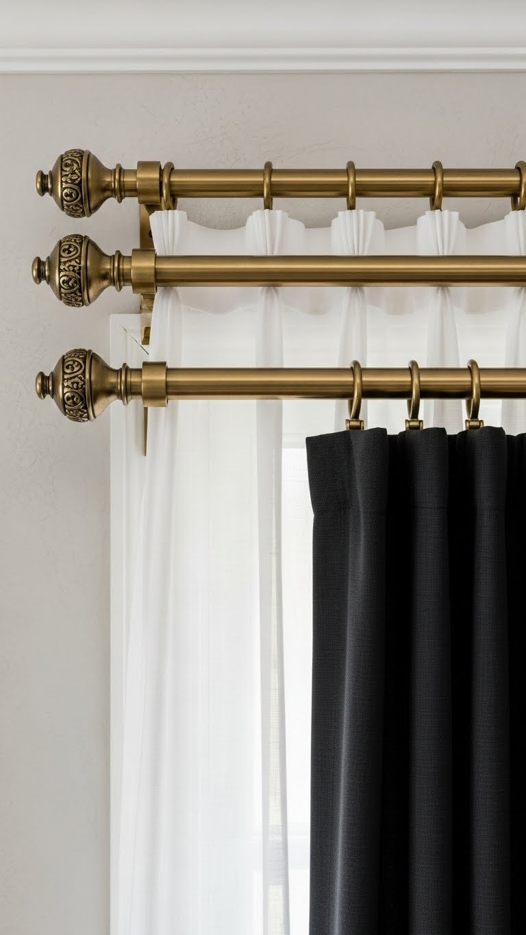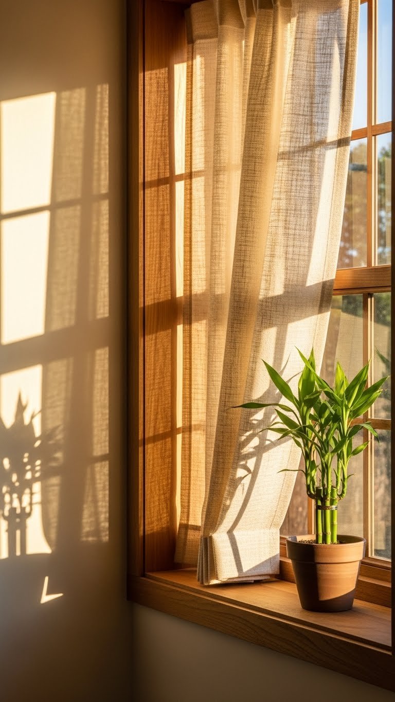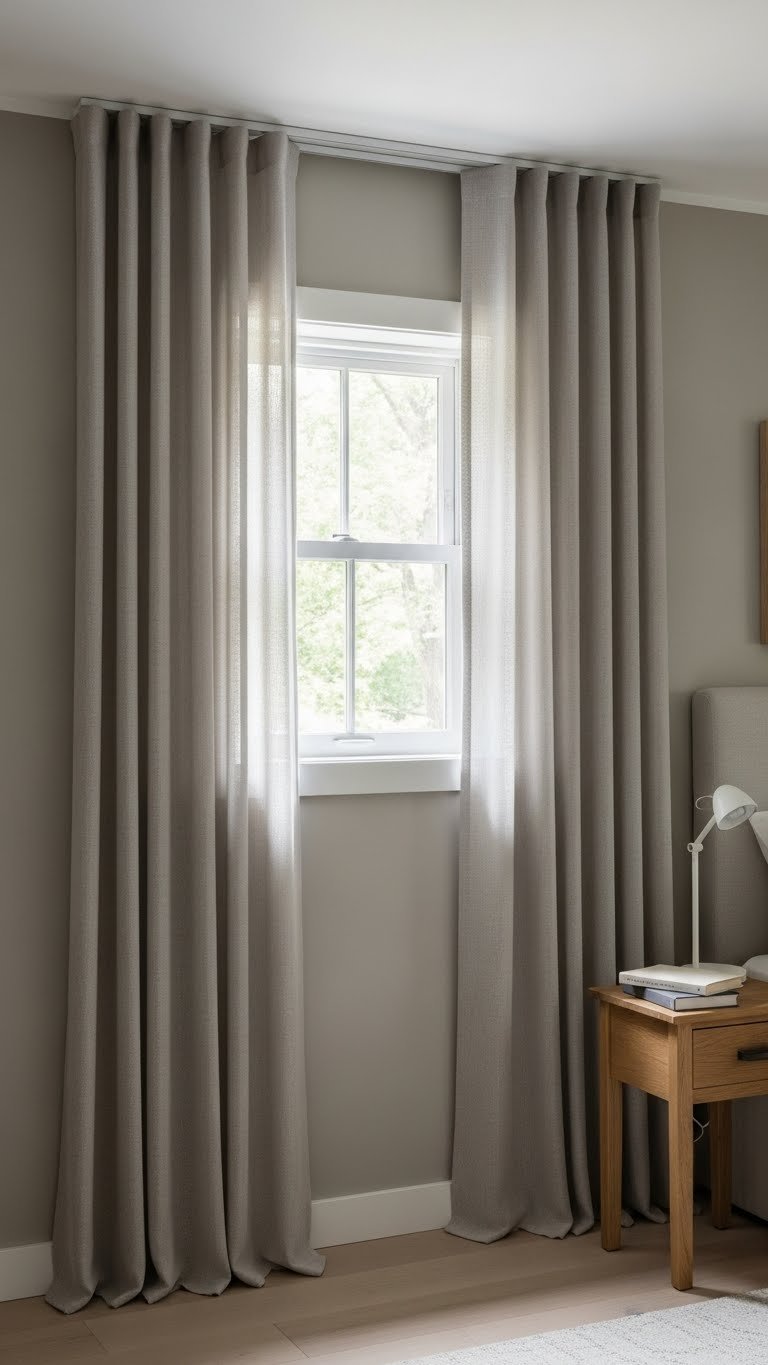 Buy lightweight linen or cotton curtains in neutral colors for $25–$80 per panel. Install a ceiling-mounted rod (removable for renters) for $15–$30. The entire project takes 1–2 hours with basic tools. Avoid heavy velvet or dark colors that make the room feel smaller. Choose light, natural fabrics that let diffused light through. Renter-friendly option: Use adhesive curtain rods or tension rods that require no drilling.