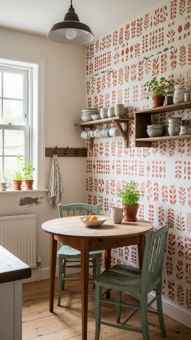Hand stenciling adds personality and texture without the commitment of full wallpaper. Stenciled patterns on a single wall create an artistic, “imperfect” charm that makes small spaces feel curated and intentional rather than cookie-cutter.