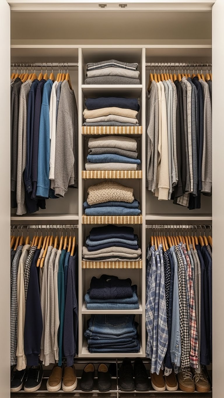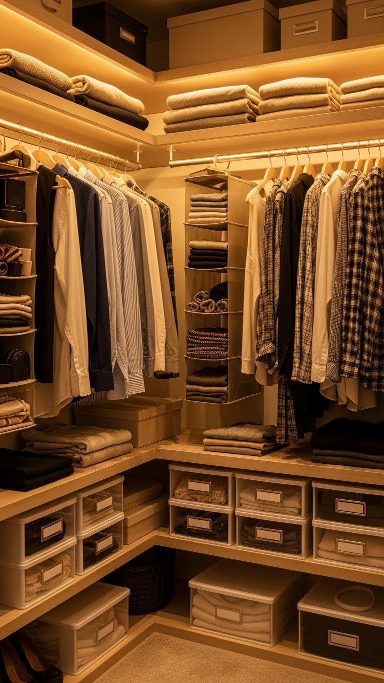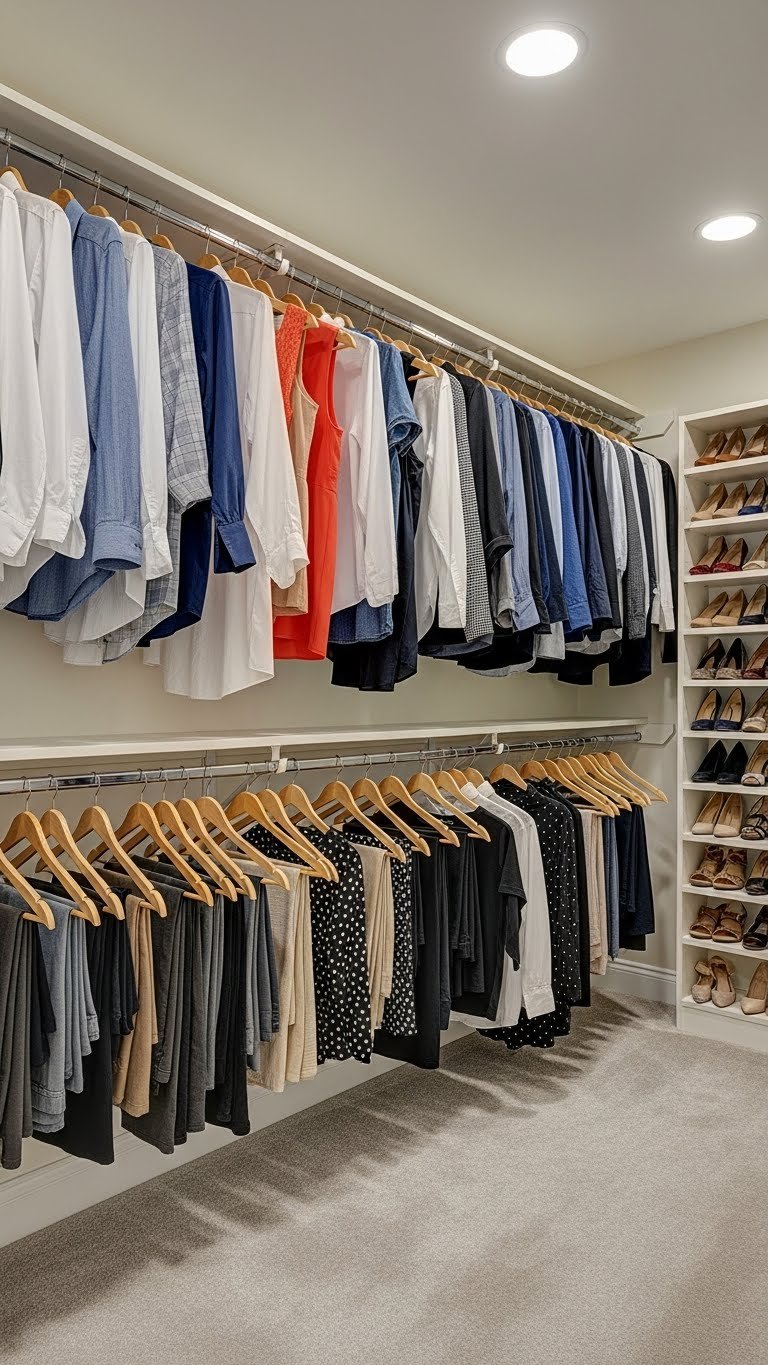 Invest in slim velvet hangers ($15–$30 for 30 hangers), shelf dividers ($10–$20), hanging organizers ($10–$25), and a labeler or clear boxes ($5–$20). The total investment is $50–$100, and the 2–3 hour project pays off immediately. Every item now has a home, and you can actually see what you own. Pro tip: Fold bulky items in clear boxes and label them so you know contents at a glance.