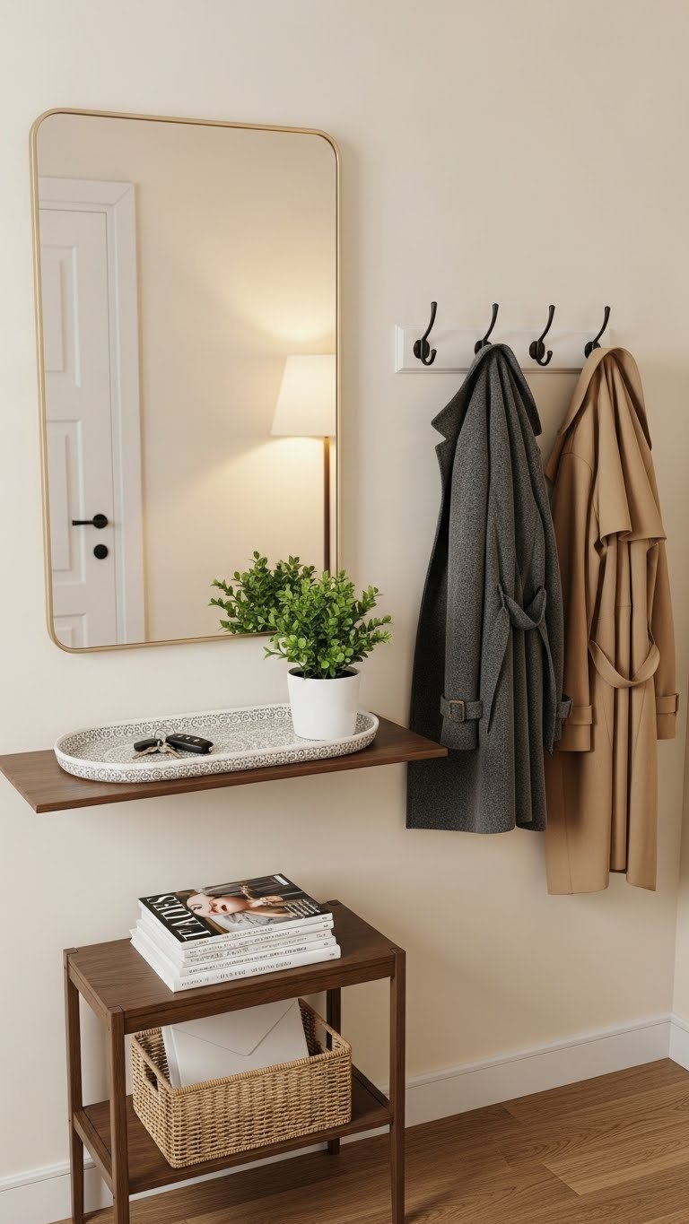 Small apartments often lack defined entryways, which makes your whole space feel disorganized the moment you walk in. A narrow console table, mirror, and hooks create visual boundary and functionality without eating into your living space.