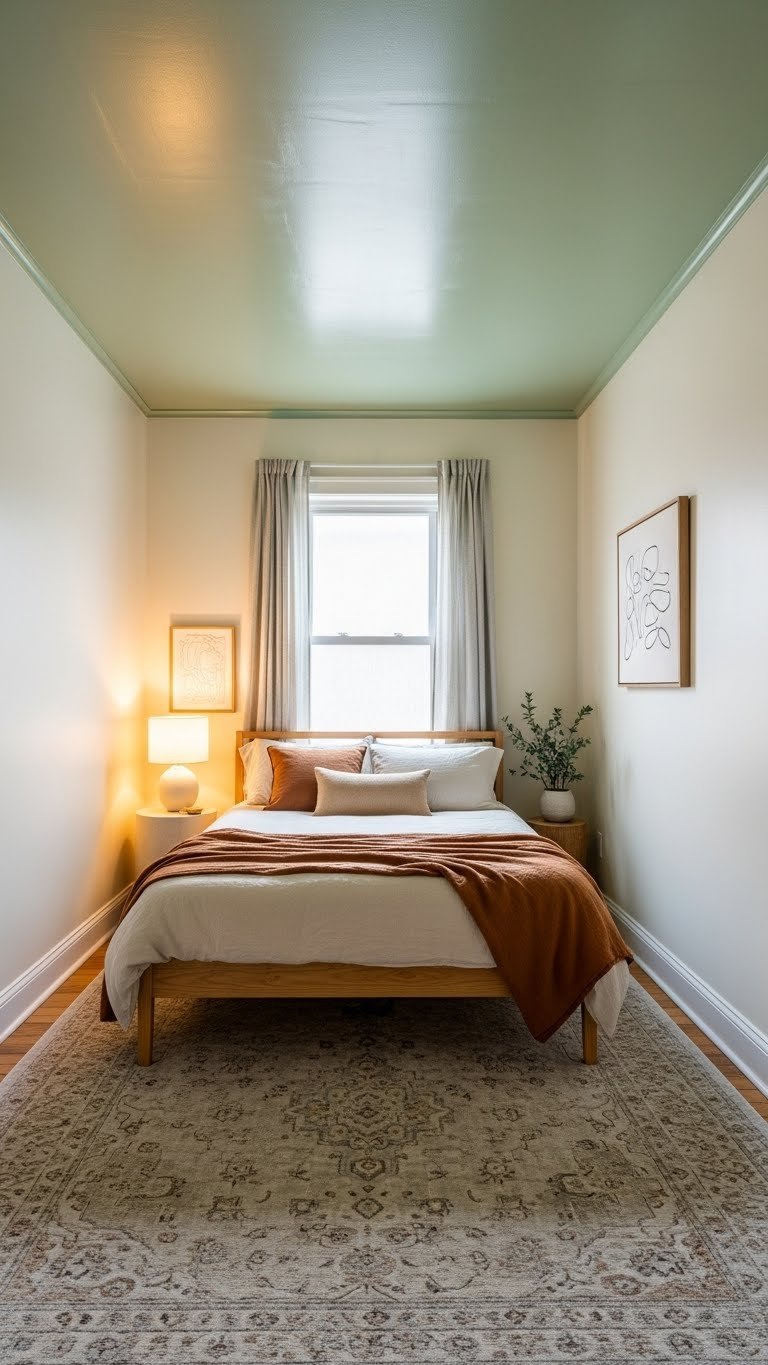 Bold ceiling colors seem risky, but painting your ceiling in a warm accent shade actually makes small rooms feel cozier and more intentional. It draws the eye upward and adds personality without the heaviness of dark walls.