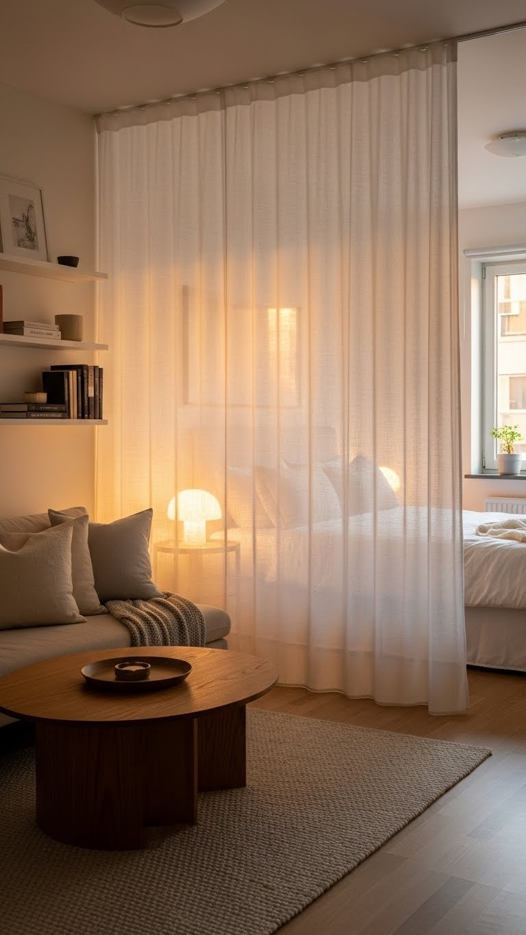 Hanging fabric dividers are renter-friendly alternatives to walls that create private zones in open studio spaces. Lightweight curtains or panels instantly define sleeping areas, office corners, or change rooms without permanent installation.