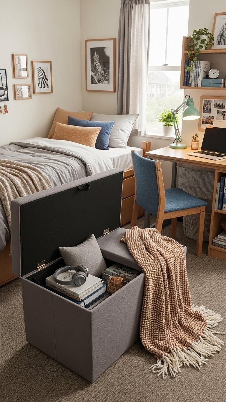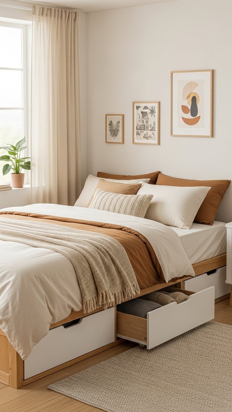 The space under your bed is prime real estate in a small room. Storage drawers that slide under your bed keep seasonal items, extra linens, and belongings organized and invisible, freeing up your closet and making the room feel less cluttered.
