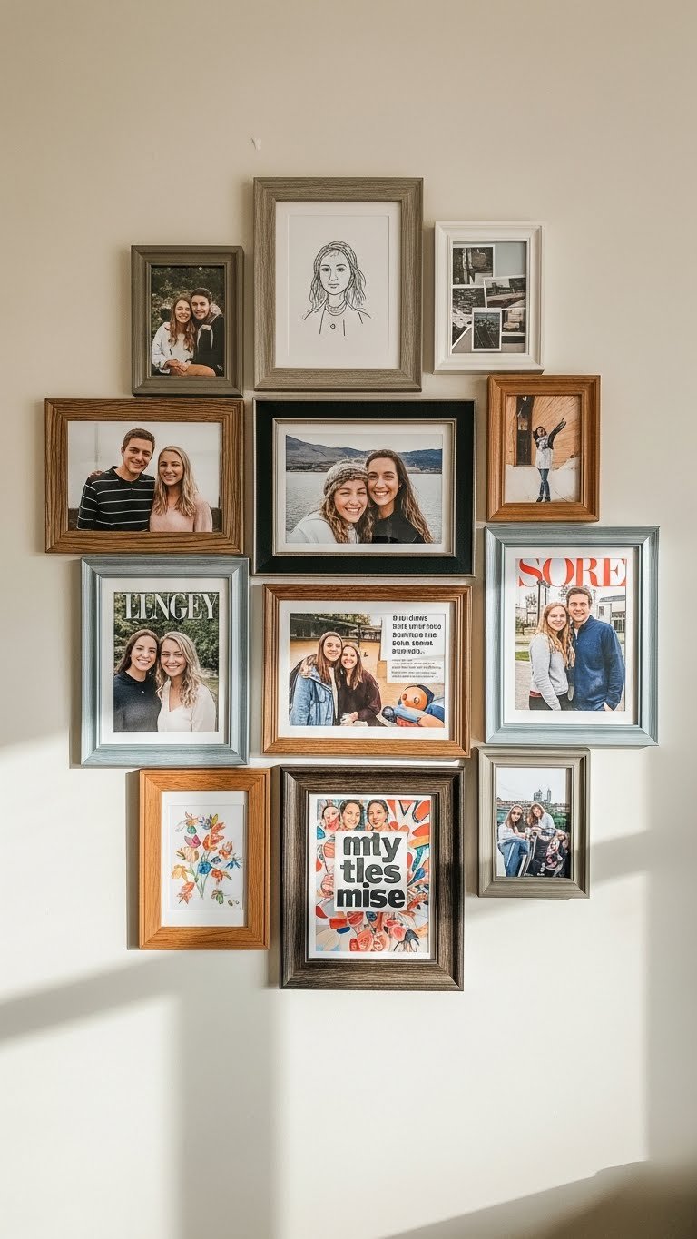 Choose 5–10 frames in coordinating finishes (all black, all white, or mixed metallics) with artwork that speaks to you. Budget $50–$150 for a mix of framed prints from Etsy, Target, Minted, or thrift stores. Plan your layout on paper first, then use a level and painter’s tape to mark positions. Installation takes 1–2 hours depending on the number of pieces. Pro tip: Mix frame sizes and artwork styles for visual interest.