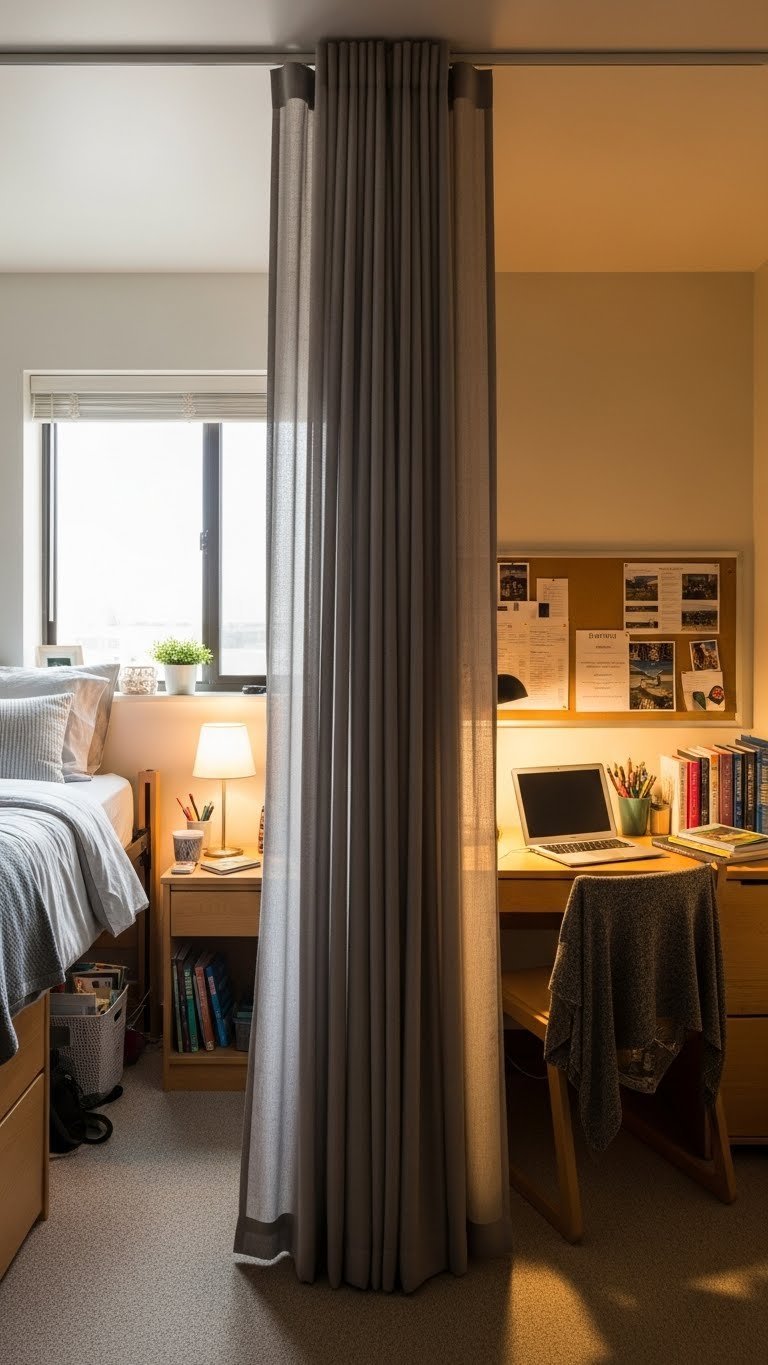 Buy lightweight tension rods ($15–$40 each) and hang neutral or patterned fabric (lightweight linen, cotton, or sheer curtains work perfectly). Total cost: $30–$100 depending on fabric choice. Installation takes 30 minutes and requires only a drill for tension rods. Pro tip: Choose fabric that filters light rather than blocks it completely, so one zone doesn’t feel like a dark cave.