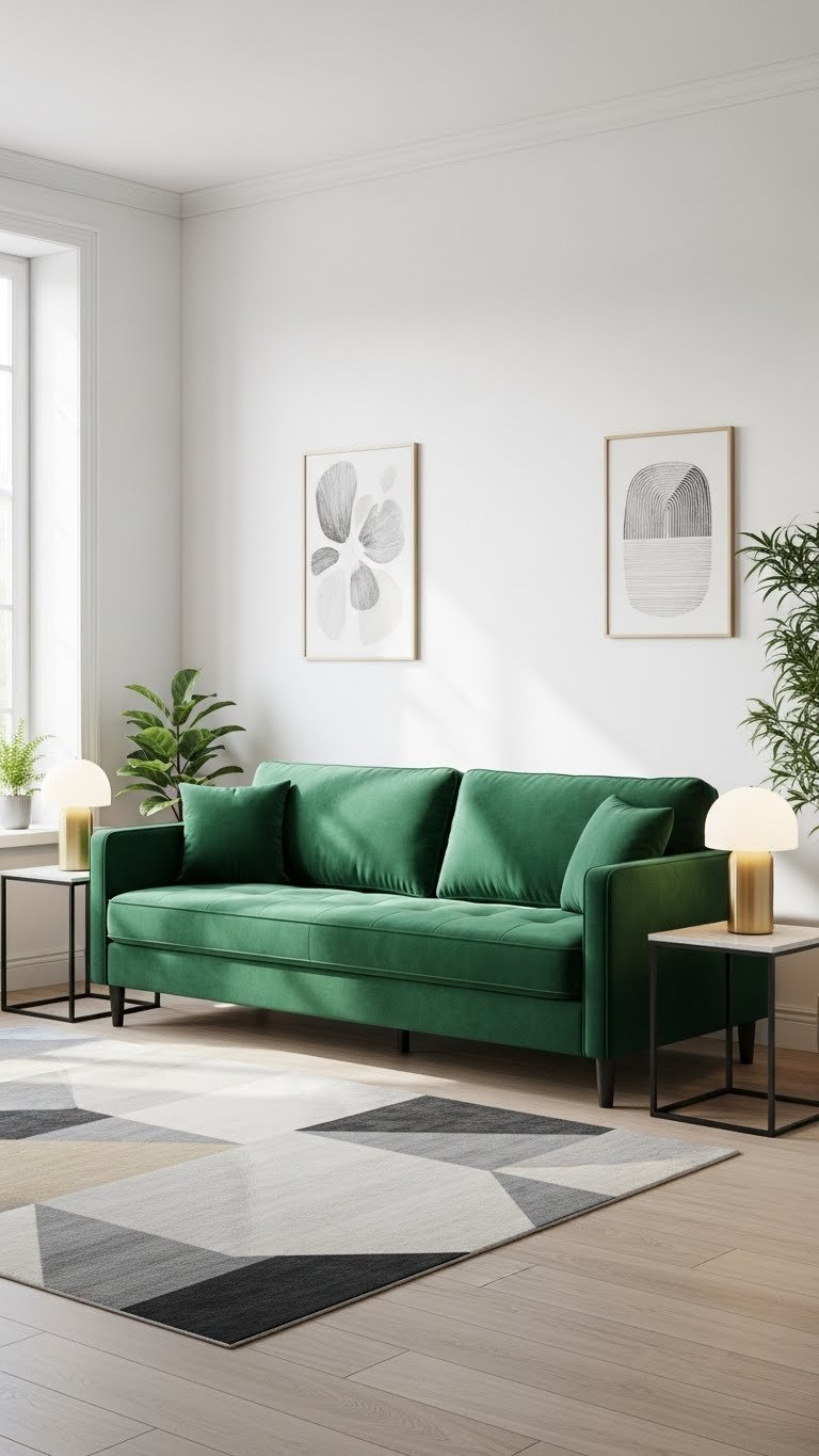 A bold-colored or textured sectional becomes the room’s anchor—think deep jewel-toned Article sectionals ($1,200–$2,000) or a made-to-order design from What A Room ($2,000–$3,500). Float it in the room’s center or position it floating perpendicular to the TV wall. This takes one thoughtful afternoon to design and arrange. Best for rooms where the sofa is your biggest furniture piece and deserves to be the visual hero.