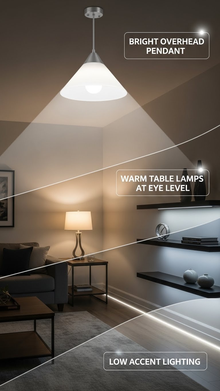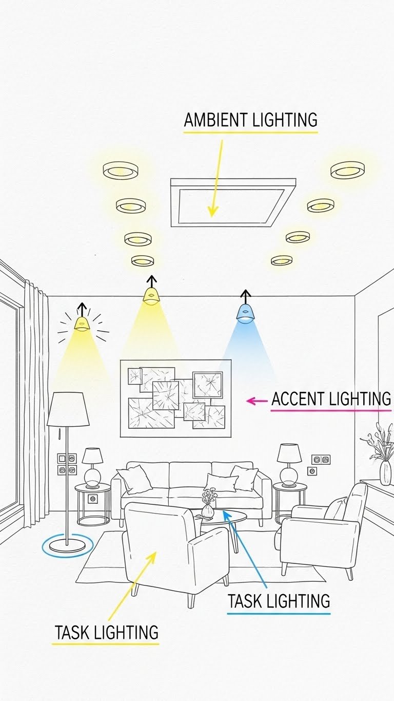 Start by identifying where you need each type. Ambient fills the whole room; task lighting clusters near seating and desks; accent lighting adds drama to artwork or architectural features. Spend an hour walking through your room at different times of day to notice where shadows fall and where you naturally reach for a lamp.
