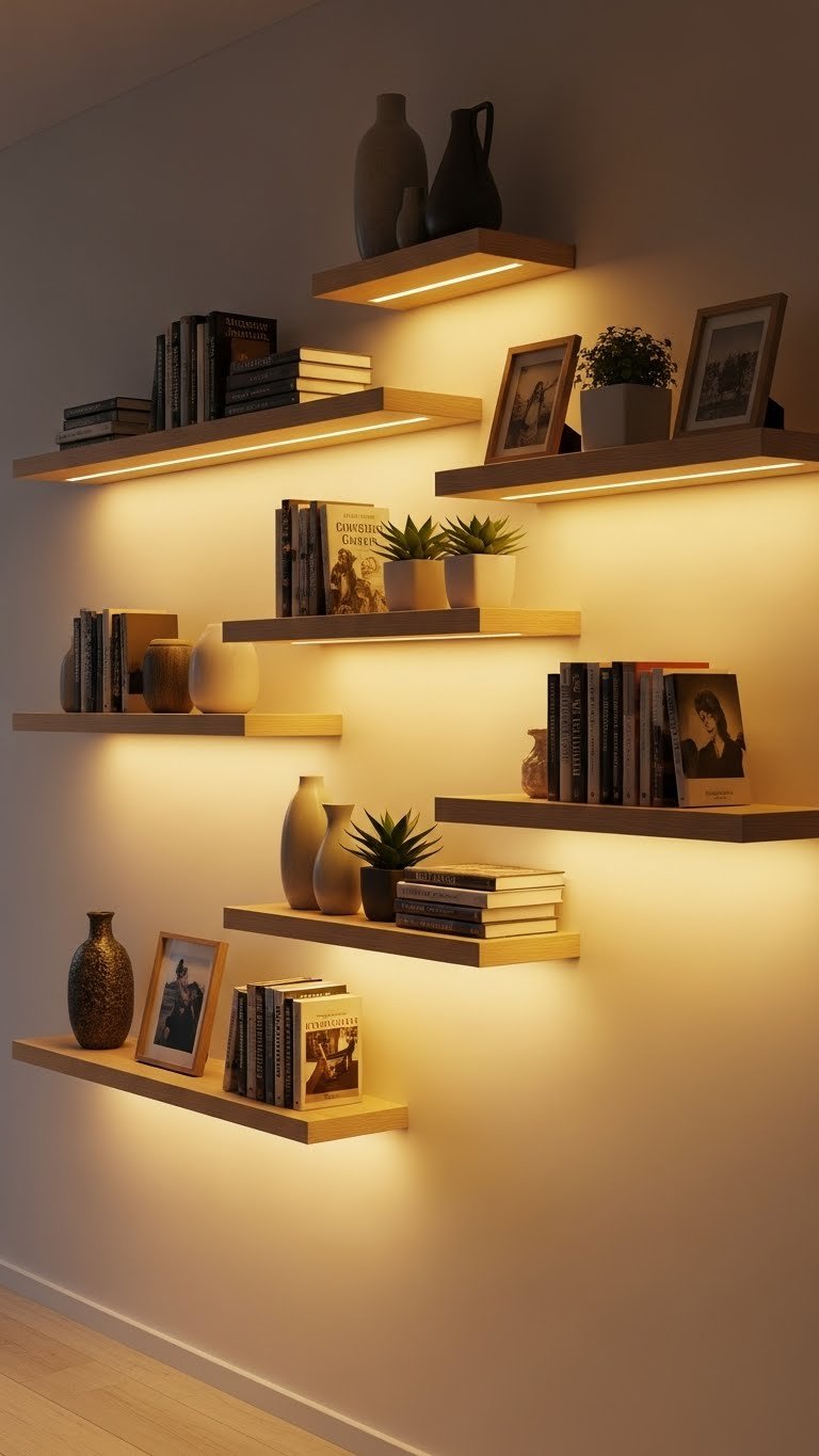 LED strip lighting is cheap, easy, and transforms how shelves feel. The downward glow highlights displayed objects while adding ambient brightness without visible fixtures.