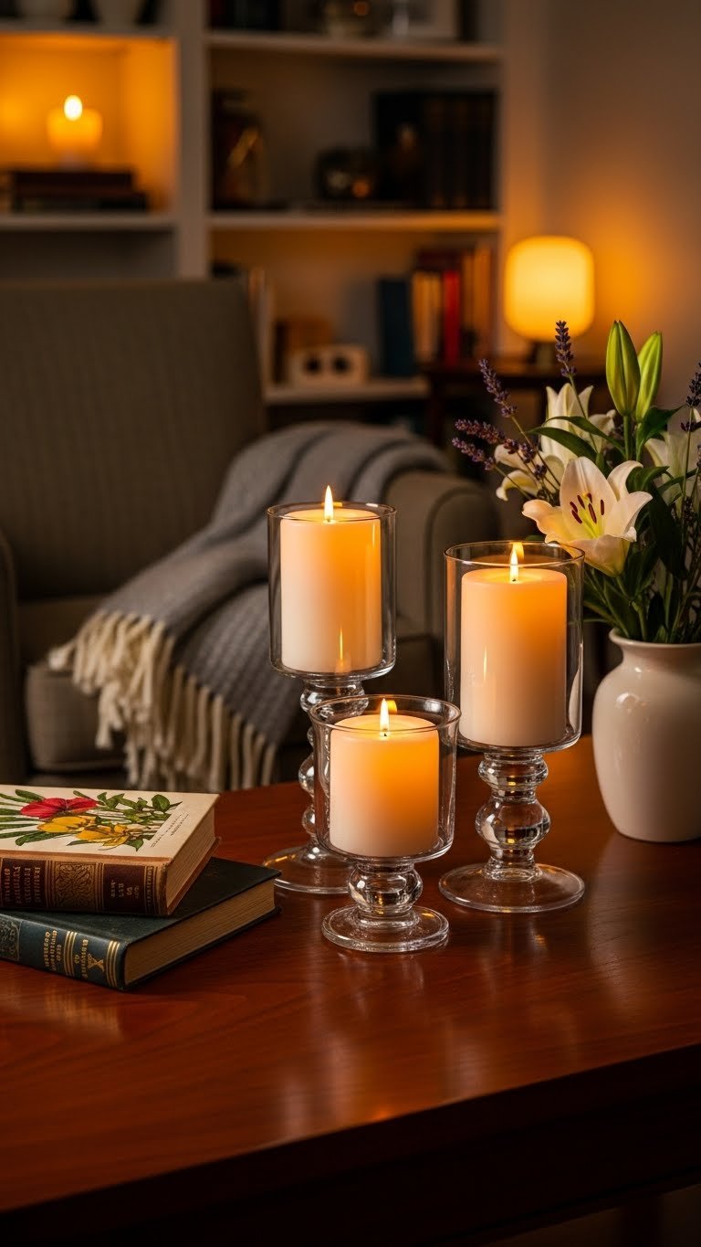 Real or faux candles instantly add coziness and cost nothing. Candles create ambient glow that feels impossible to replicate with electric light alone.