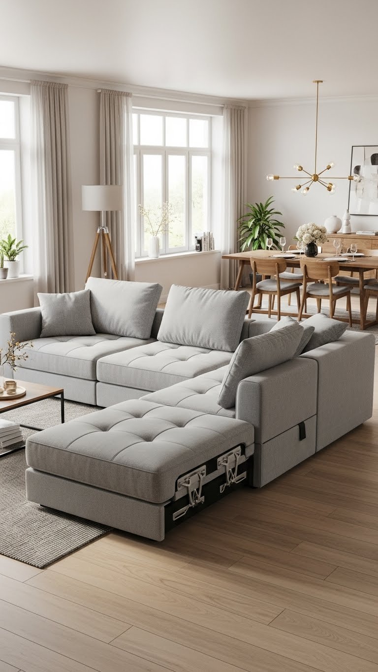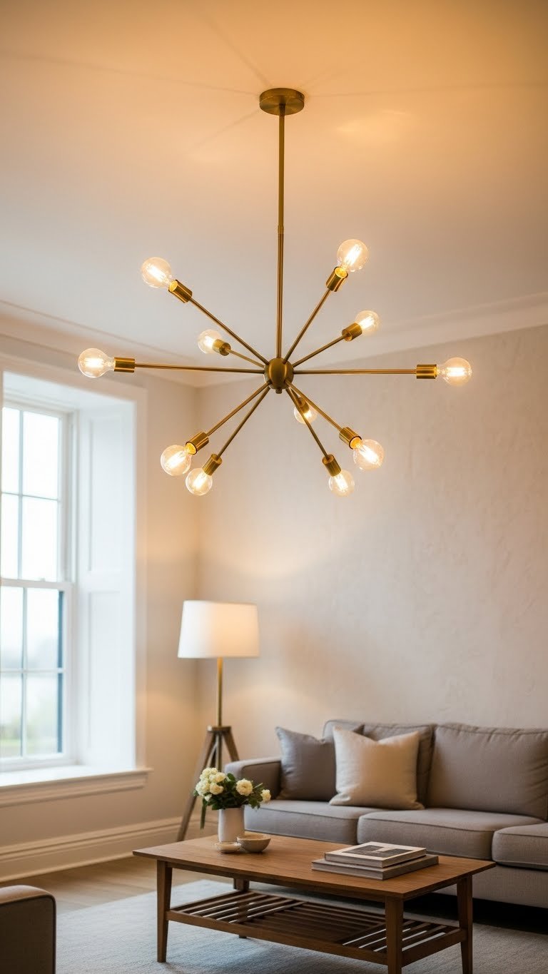 If you have ceiling height (9+ feet), a statement chandelier anchors your room and provides serious ambient light. Modern chandeliers feel less formal than traditional crystal versions—think sculptural brass, geometric lines, or woven materials.