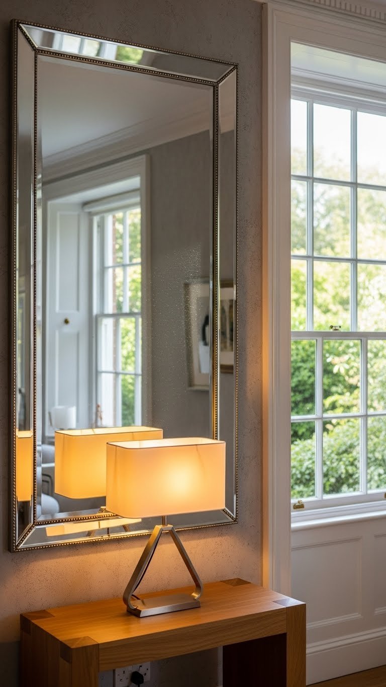 A large mirror costs $50–$200 depending on frame style. Installation takes 30 minutes. Smaller accent mirrors ($20–$80) also work on shelves or consoles. The key is opposite placement: mirror facing your light source bounces brightness deeper into dark corners.