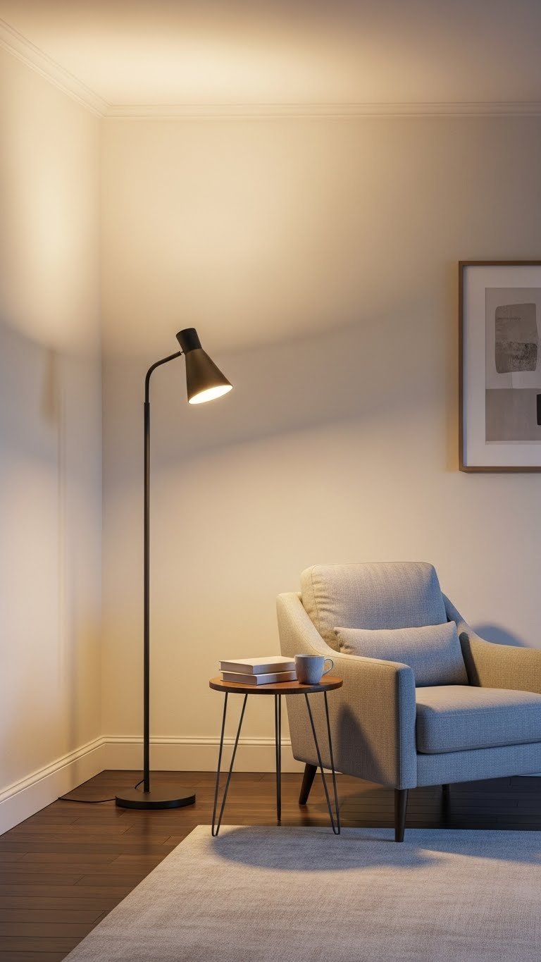 An uplight floor lamp or an adjustable floor lamp angled toward the ceiling costs $60–$150. Position it in corners or beside furniture so the light source isn’t directly visible. This works beautifully paired with dimmers for mood control.