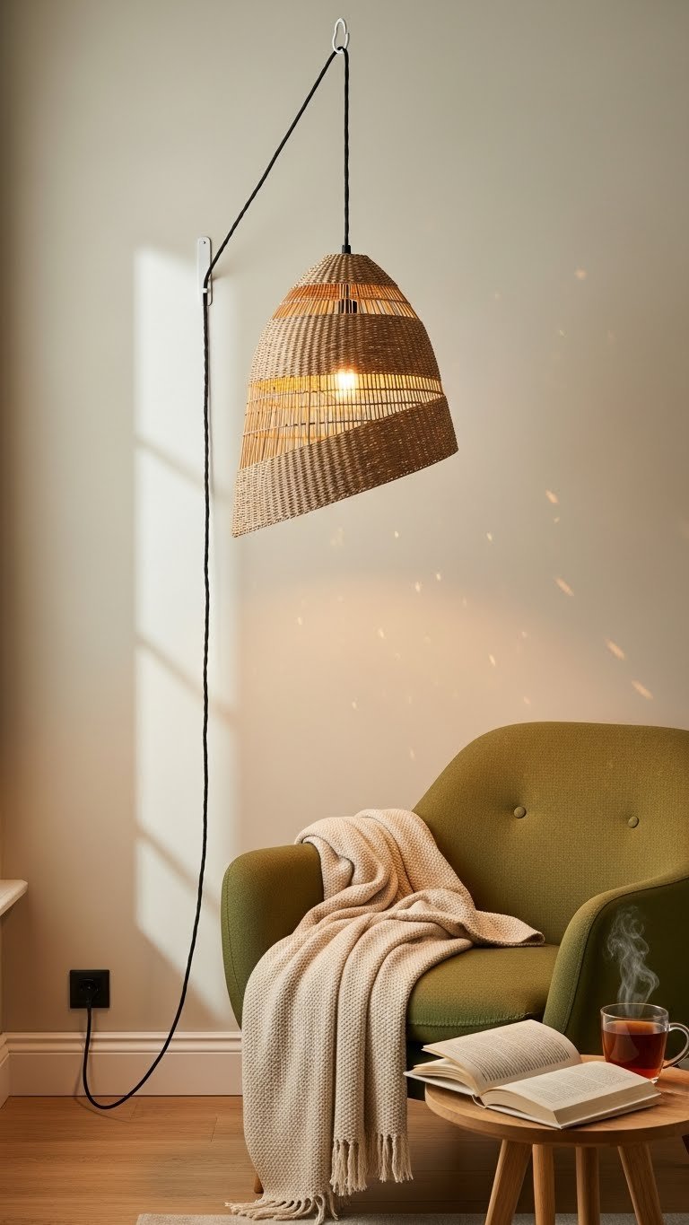 Options cost $30–$100 and are available everywhere (Amazon, Target, IKEA). Swag-style pendants look especially intentional hanging off a hook. Installation takes 5 minutes and reverses instantly.