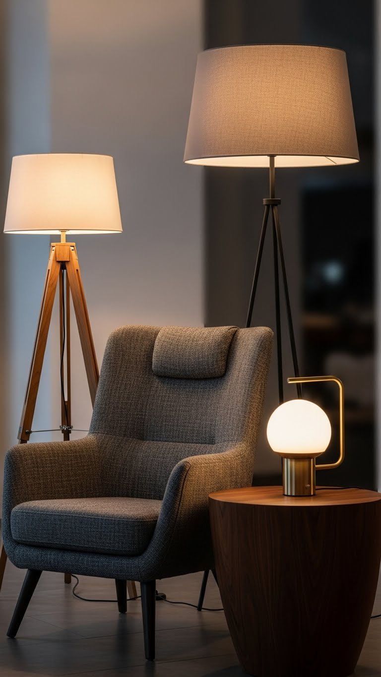 Table lamps create pools of light that feel intimate and let you control brightness in specific zones. The key is using at least two different heights per room section to avoid a flat, repetitive look.