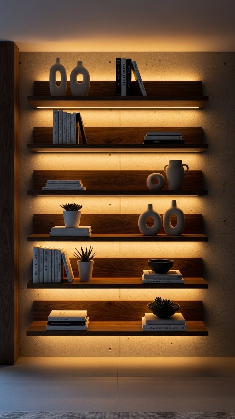 19. Try Backlit Wall Shelving for Modern Ambiance